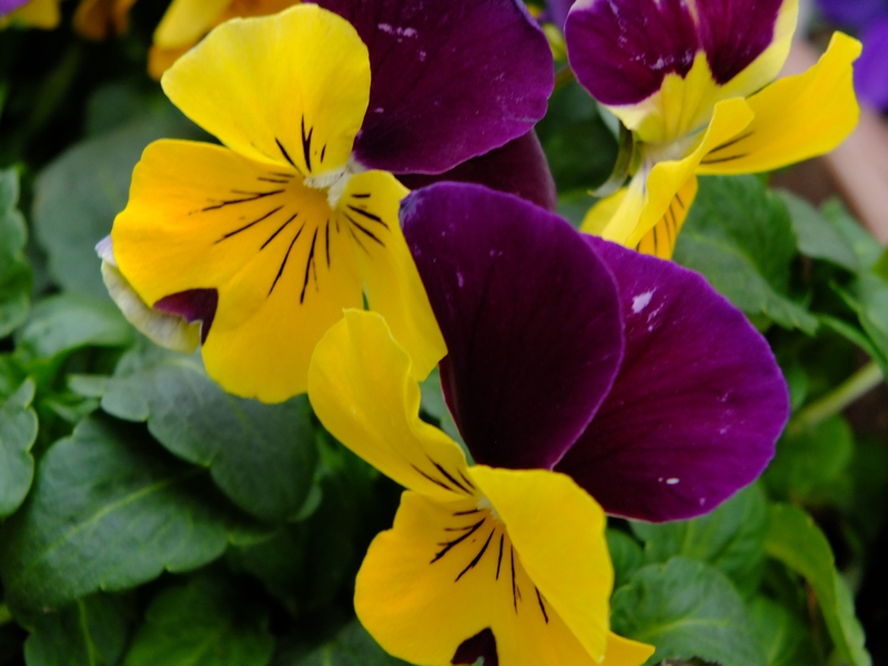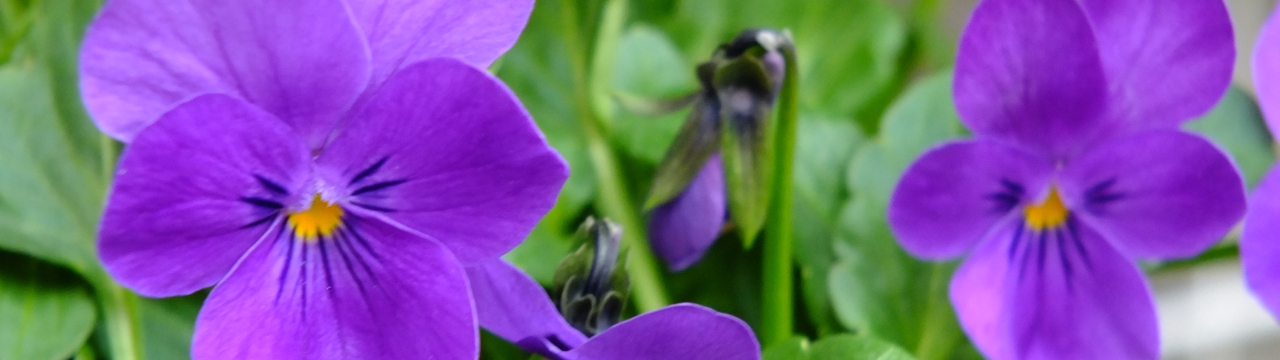 ・ビオラ、パンジーを入れた鉢、プランターで咲いています。