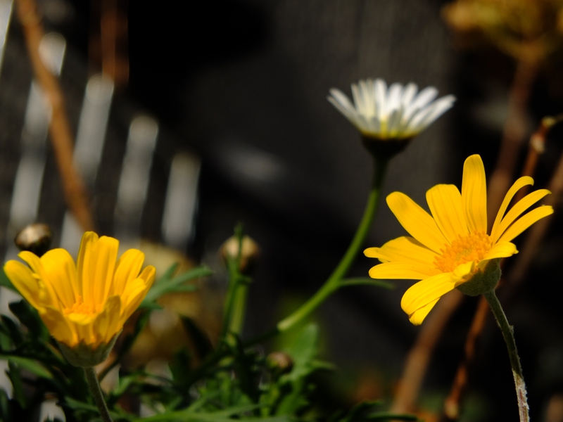 お家のお庭でアンスンエンシス、プリムラ、ユリオプスデージー、クリスマスローズ、コニファー、デージー
