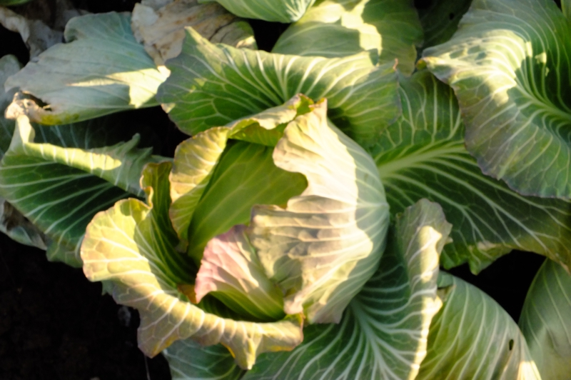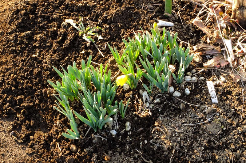 畑で不明、水仙の芽、キャベツ、チューリップの芽、ブルーベリーの花芽、シバザクラ