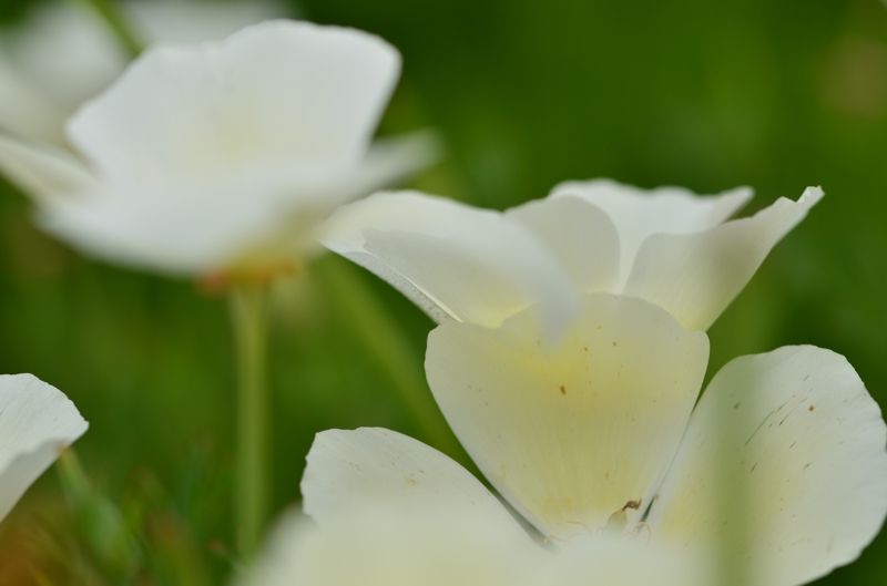 畑でハナビシソウ4つ、ヒメシオン、天人菊の咲きかけ