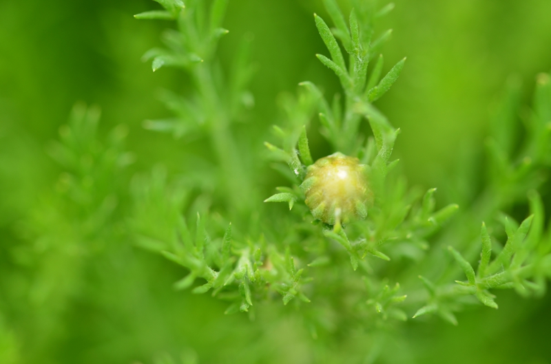 畑でねぎぼうず、菊、トマト、ミニカボチャ、ローマンカモミールの花芽、名前不明