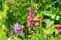 畑でペチュニア、木イチゴのお花、わかりません、除虫菊、ジキタリス、オリエンタルポピー