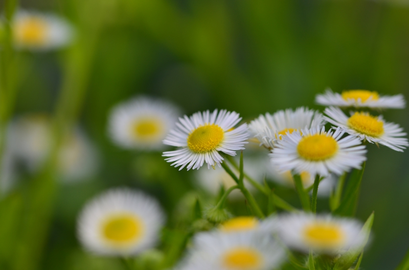畑でローマンカモミール、不明、昼咲き月見草、宿根バーベナ、ヒメシオン、コモンマロウ