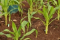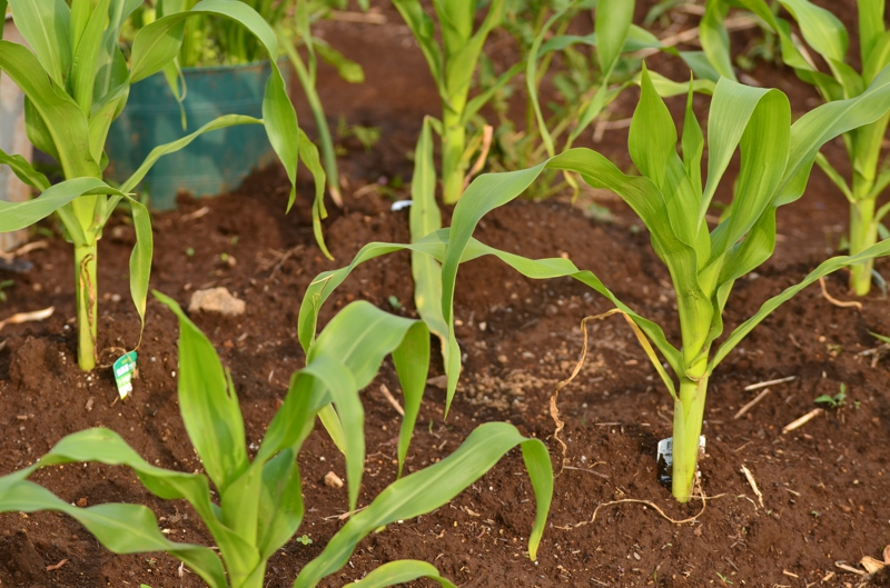 畑でさといも、ポピー、マリーゴールド、ひまわり、とうもろこし、落花生
