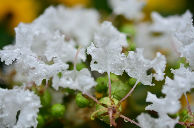 お家のお庭サルスベリ ルドベキア、ベンジャミン、ニチニチソウ、タイタンビカスのつぼみ、クロサンドラ