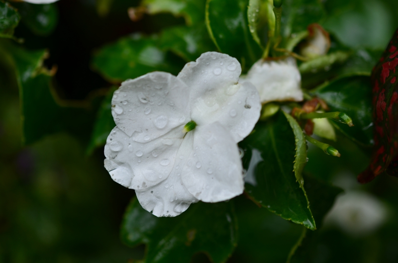 お家のお庭でインパチェンス、バラ2つ、何かの実、コルチカム2つ