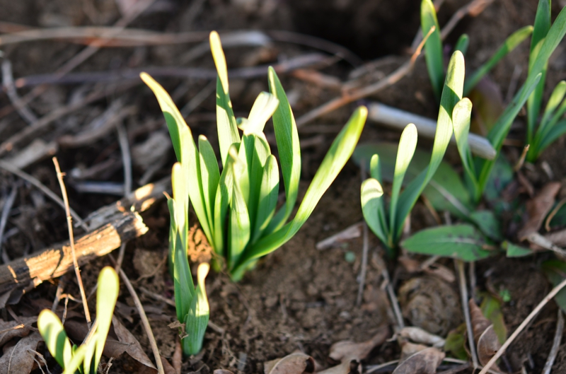 畑でヤロウのロゼット、ジキタリス、水仙、スノードロップ、シルホサの綿毛、ダイコンの芽だし