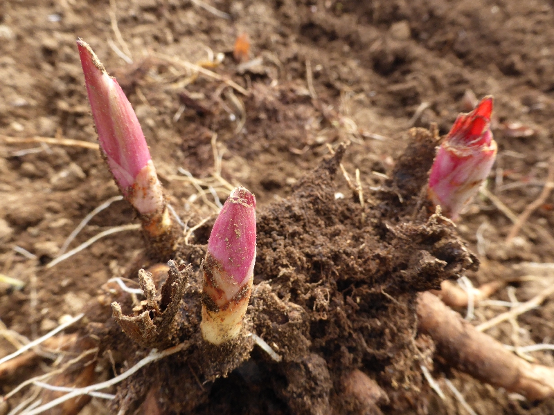 畑で掘り出したシャクヤク、いちご畑、だいこん・たまねぎエリア、芝桜、花道2つ
