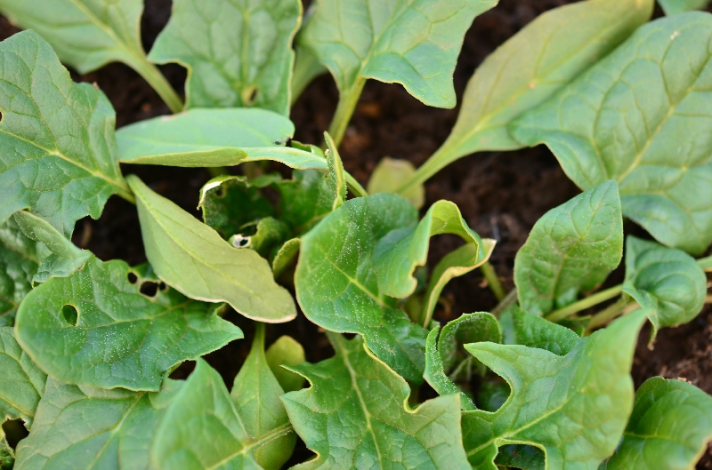 畑でエンドウマメ、ソラマメ、チンゲンサイ、だいこんの葉っぱ、タマネギ、ホウレンソウ