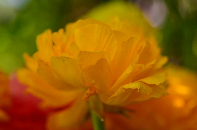 お家のお庭でチューリップ4つ、ラナンキュラス、モッコウバラの花芽
