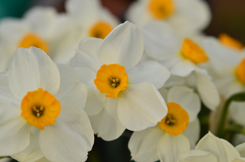 お家のお庭でサイネリア、ペチュニア、ムスカリ白、カロライナジャスミン、つばき、すみれ