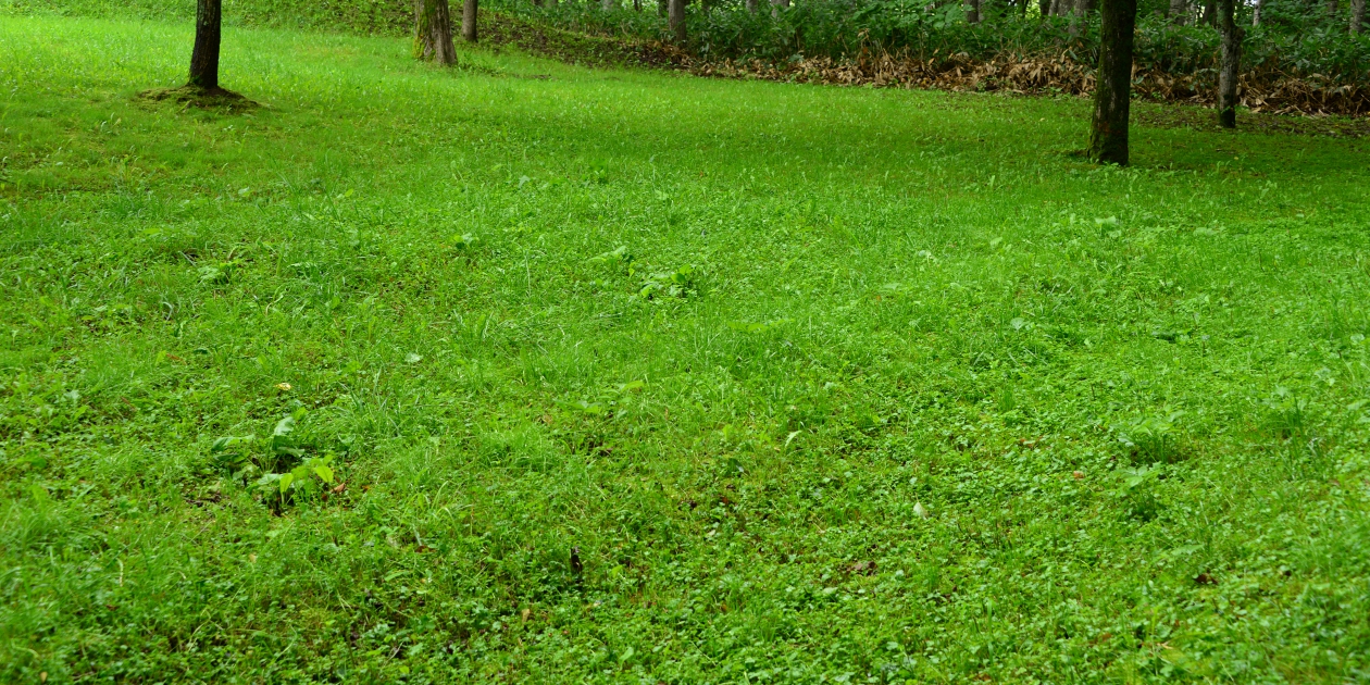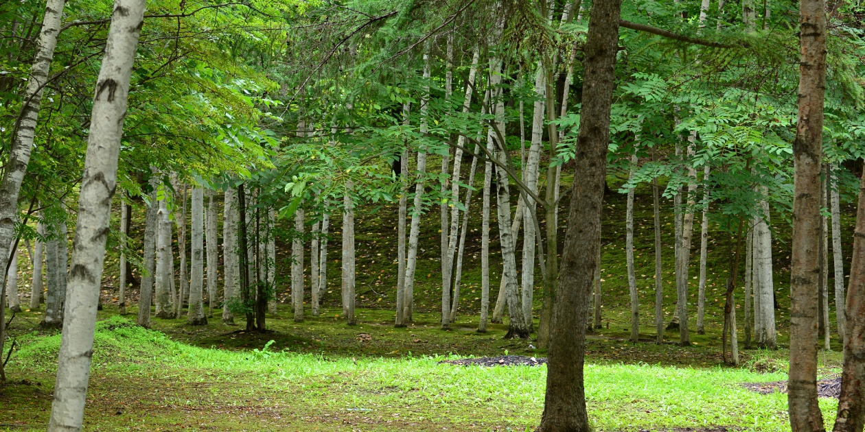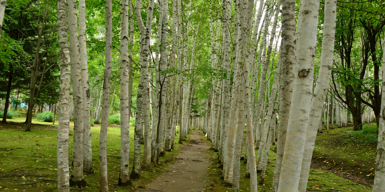 ■続いて柘真館のしらかば回廊を見てみることにしました。観光バス1台で乗用車2台と少なめで、奥にあるだれもいないしらかば回廊を歩くことができました。コケむした場所に薄日が射して明るくなっていて、暗い木々の 間から明るい緑が見えていました。