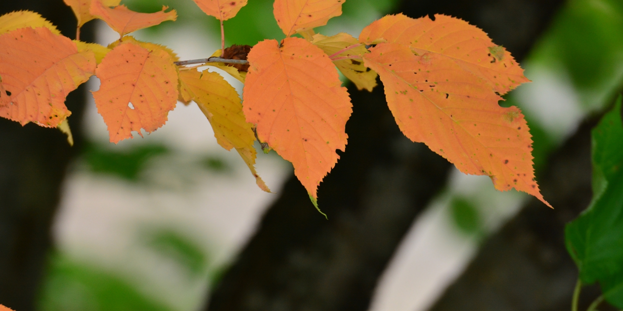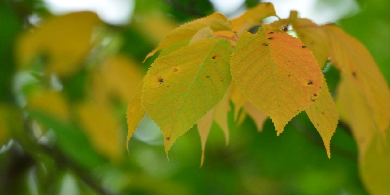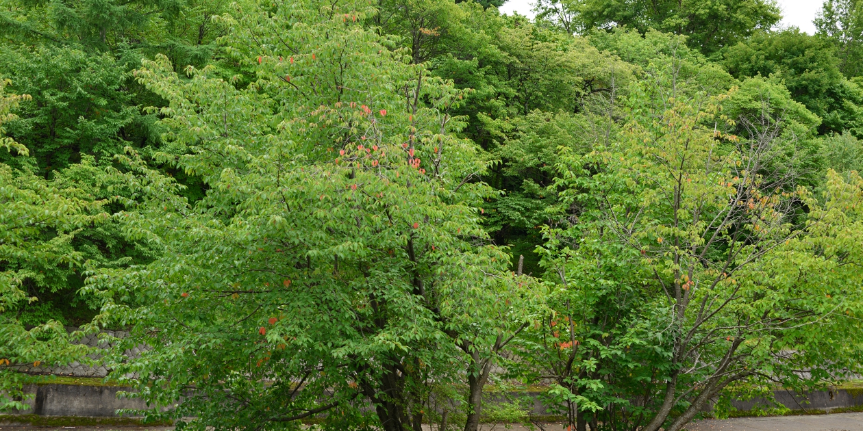 ■細かい雨が降っていましたが、少しばかり薄日も射していて明るくなってきました。 近場の美馬牛の森に寄ってみますが、例の歩道が壊れているままのようで、まだ中に入ることができませんでした。入り口近くの木々を明るい場所と暗い場所をセットに撮ってみました。また、手前の桜の木の葉っぱが色づいている枝がありこちらも撮っておきます。親子が一組歩いて美馬牛小学校を見てました。