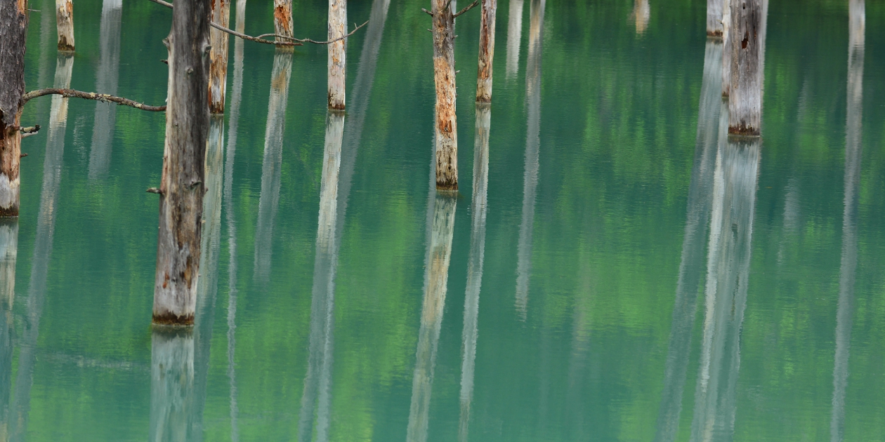 ■そこそこに青い池に移動します。駐車場は手前がバス、少し走って一般車になっていて、歩く距離が短くて済みました。道は水たまりだらけで車は汚れます。奥に進むと池側の道におりる階段がありましたが、そのまま高い場所の道を進んで奥に行きます。川の流れまで行くと、なにやら撮影用のアームとちょっとした舞台が置いてありました。何に使うのでしょうか。しばらくぼーっと見ていると、4組の方から記念撮影を頼まれました。雑談をしてしばらくを過ごせました。戻りつつ池の様子を見ていきますが、青色よりは緑色に近い感じで、しらかばも痛んでいてつらそうでした。奥に黄色く色づいた木がありましたので、入れ込んで撮ってみました。奥から騒がしい声が聞こえてきましたが、いつもの台湾か香港の観光の方のようです。