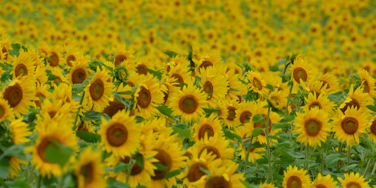 ■美田まで出て新しい道から瑠辺蘂を通り、いつも朝日を撮る高い場所を通り、砂利道に入り二股のからまつ林を通ってから千望峠方向に走ります。途中、富良野に降りて行く道に入りしばらく道なりに走ります。もう少しで学田駅というところで右手に黄色のひまわりが見えましたので、ちっょと立ち寄ってみます。下から上に向かって咲いていて結構見応えあります。また、遠くにもひまわりが見えました。