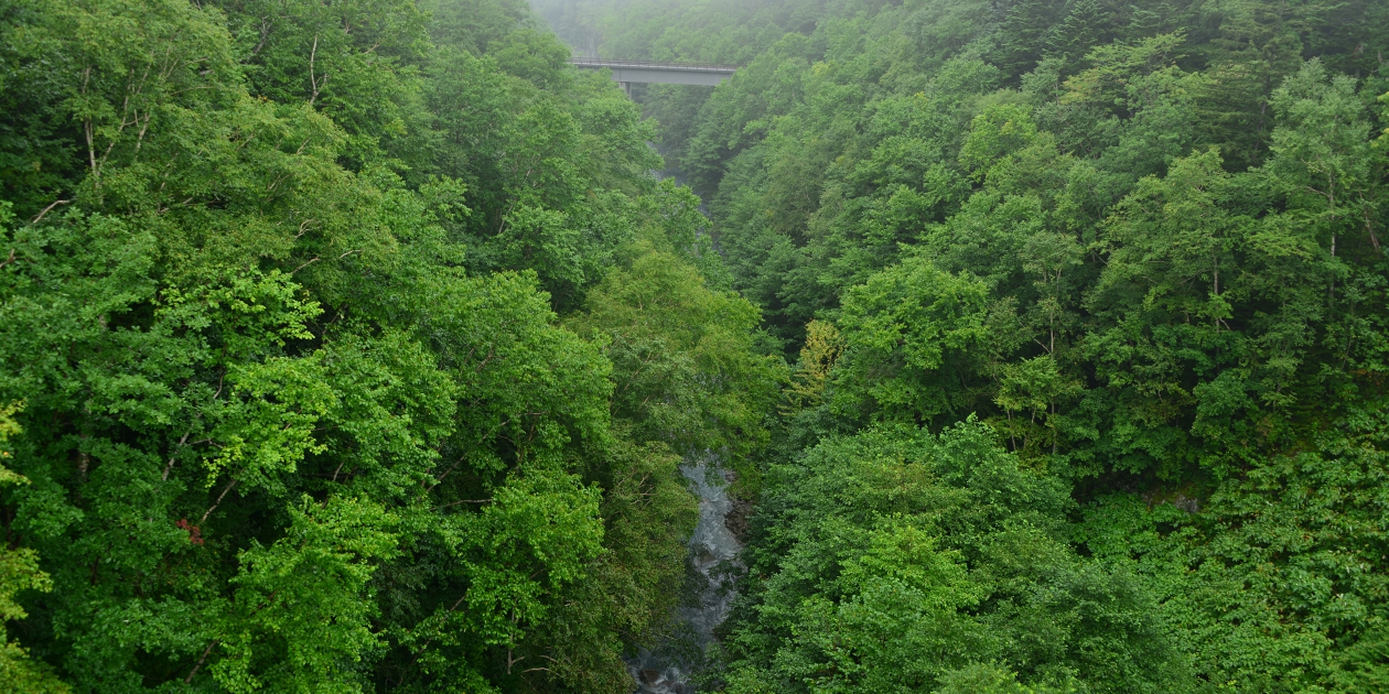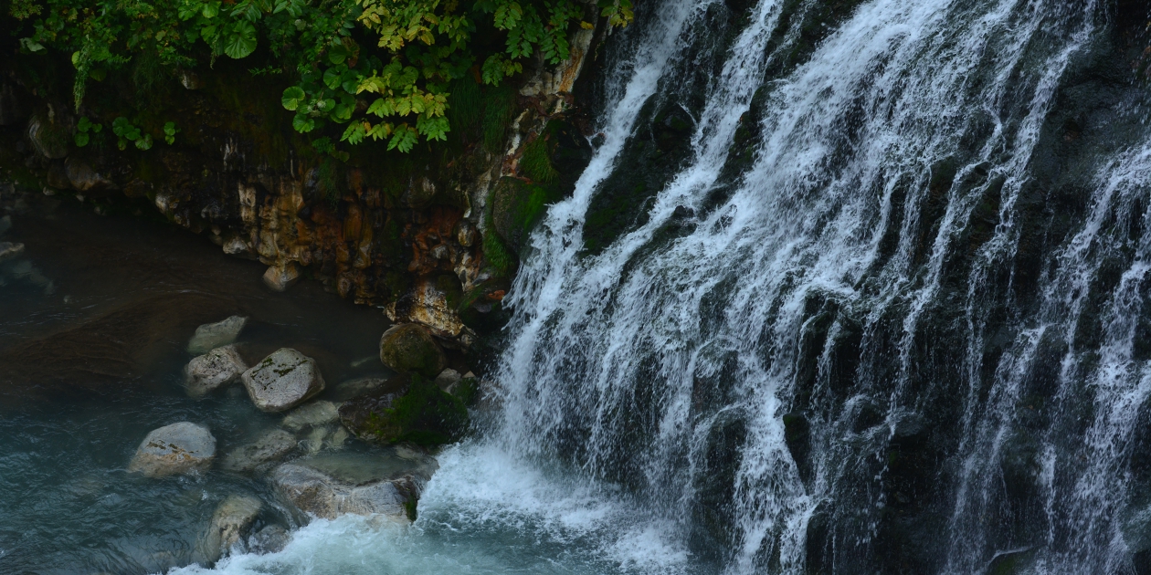 ■すでに3時過ぎになっていたのですが、一旦十勝岳温泉方向に走って吹上温泉を通って白金温泉のしらひげの滝に寄ってみます。十勝岳温泉と吹き上げ温泉の分岐までは結構遠くいですが、霧が出て神秘的な道を走って行きました。白金温泉の観光案内所に止めて少し歩いて滝を見てきました。高いところが苦手なのでおそるおそる覗いてきました。下流側にかかる橋も霧でかすんでいましたが、タクシーで来ている方もおられました。