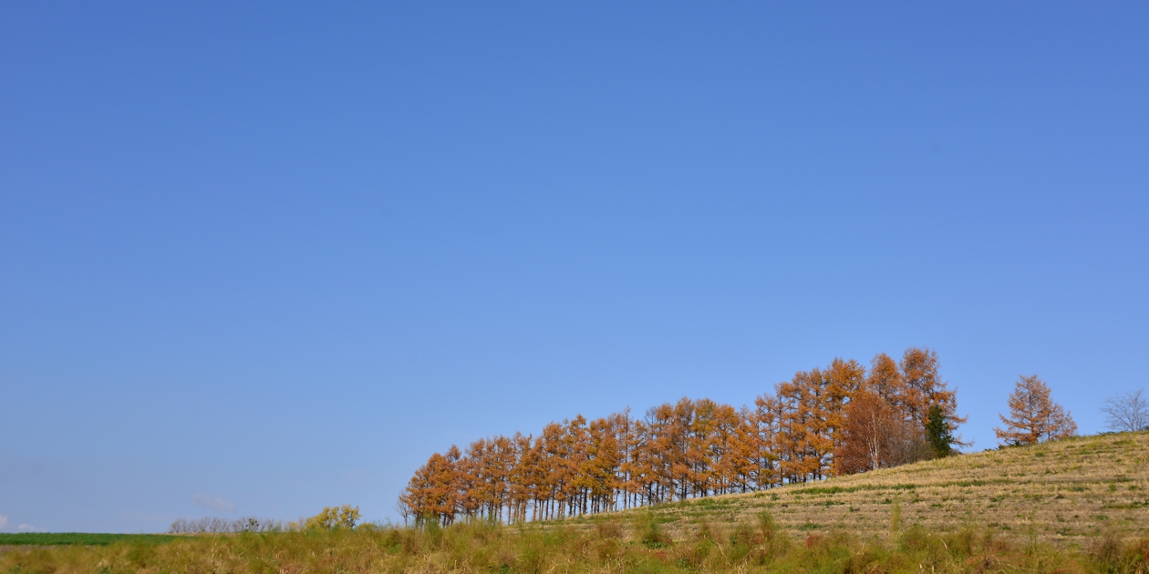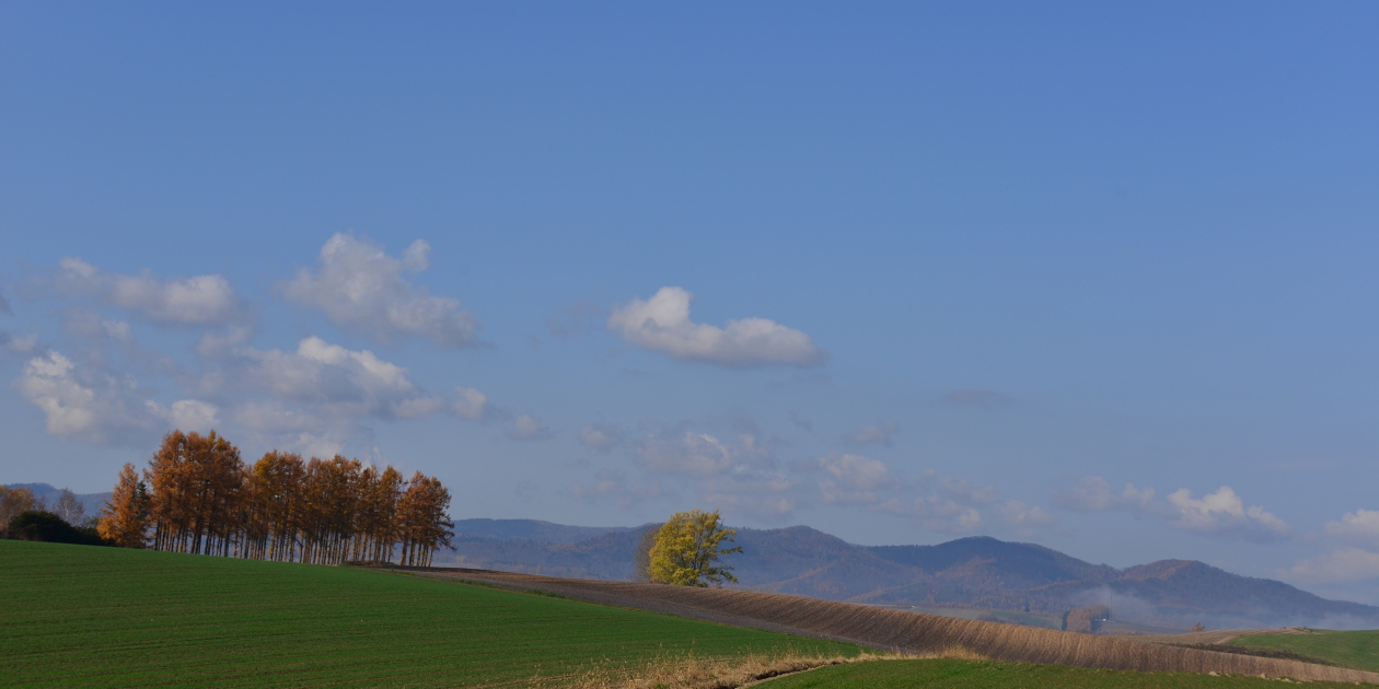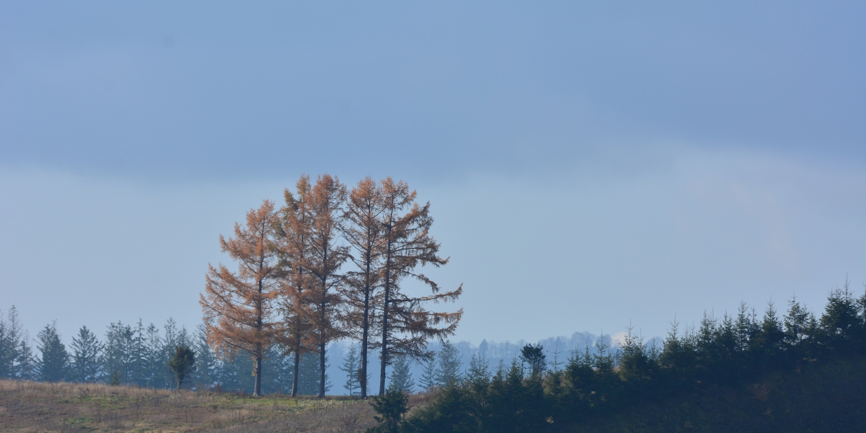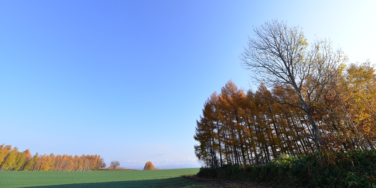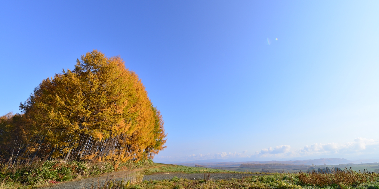■間近で何枚か撮って、もう少し先にあるもっと奥の斜面も望遠で撮っておきます。そのまま瑠辺蘂からかんのファームの前に出て、5本の木を美馬牛峠の空き地から見ておきます。5本の木は色づいていたのでからまつなのですね。、ジャガタラさん方向に戻りながら裏からマイルドセブンの丘の裏へ出ます。その美馬牛峠からニオが少し遠い場所にあるのに気づき望遠で雰囲気だけ撮っておきました。