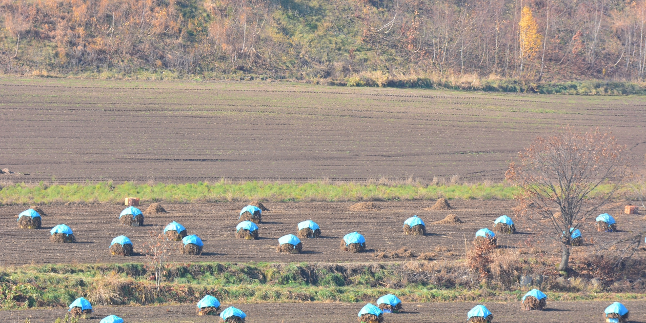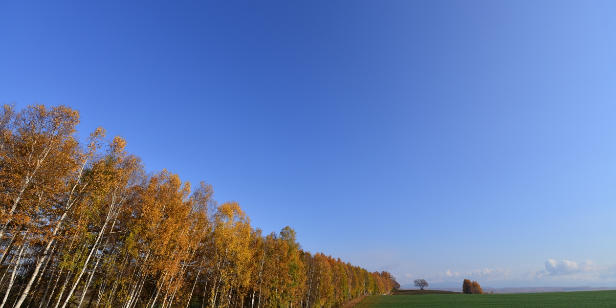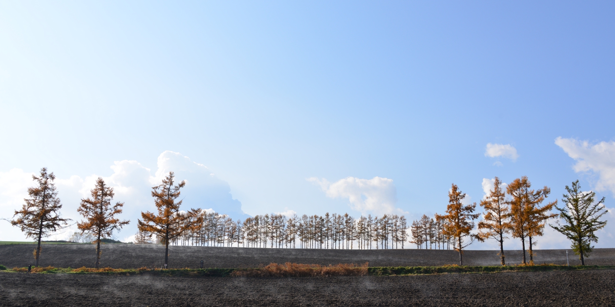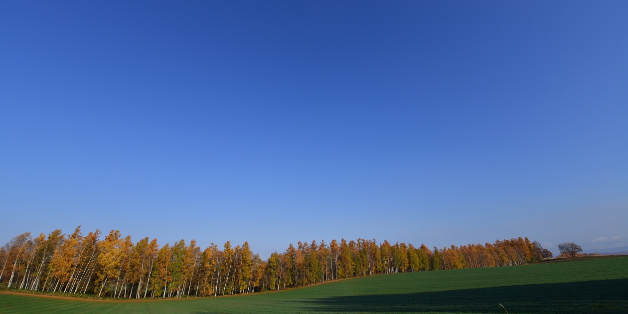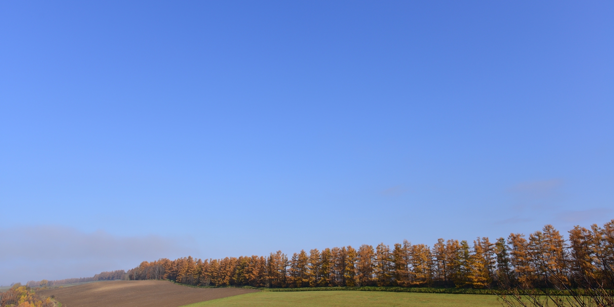 ■間近で何枚か撮って、もう少し先にあるもっと奥の斜面も望遠で撮っておきます。そのまま瑠辺蘂からかんのファームの前に出て、5本の木を美馬牛峠の空き地から見ておきます。5本の木は色づいていたのでからまつなのですね。、ジャガタラさん方向に戻りながら裏からマイルドセブンの丘の裏へ出ます。その美馬牛峠からニオが少し遠い場所にあるのに気づき望遠で雰囲気だけ撮っておきました。