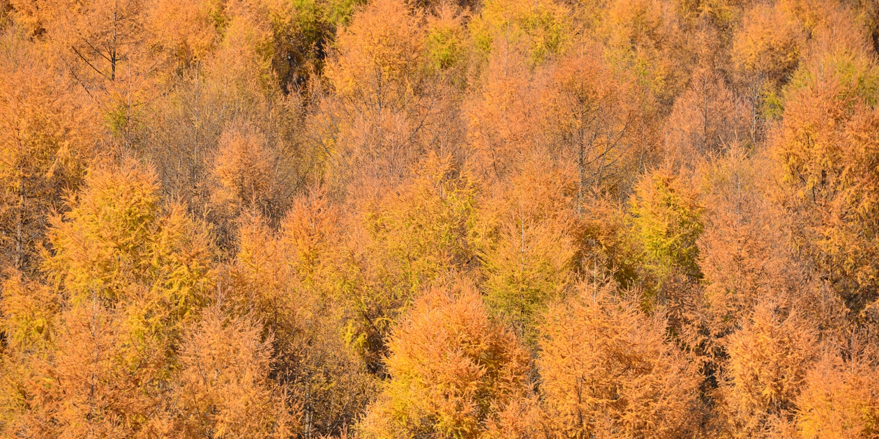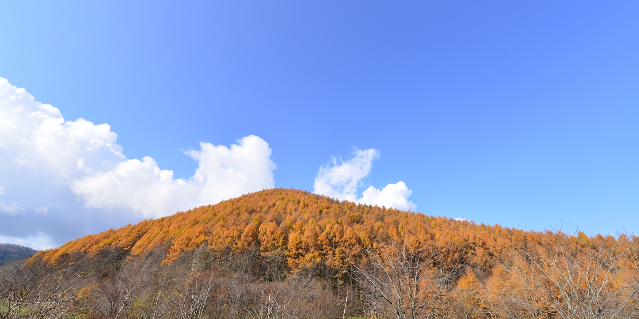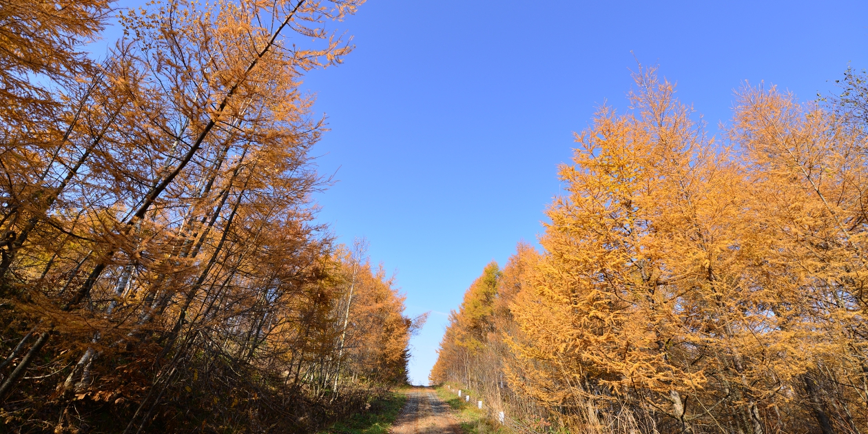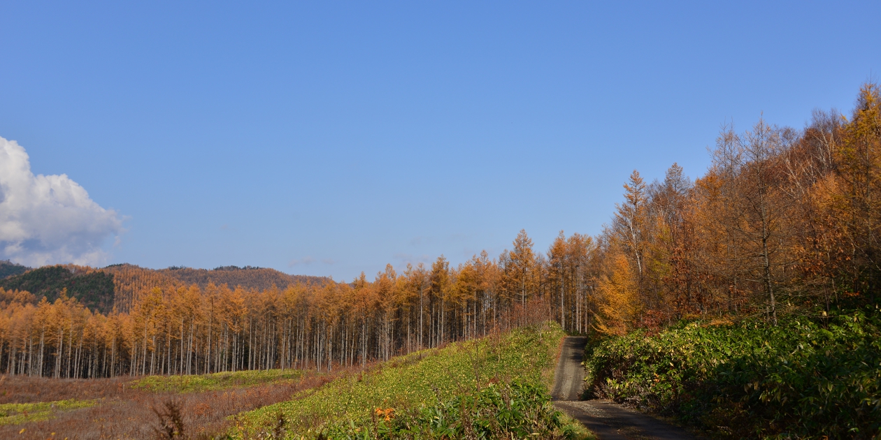 ■やまびこ高地に抜ける道から砂利道に入っても霧で、少しずつ登って最後のところで霧の外に出ました。このまま山彦高地付近も霧だったらどうしようと思いましたが、運良く予定していたからまつの黄葉は青空の下で撮ることができ、何年かぶりに青空とセットで撮影できました。