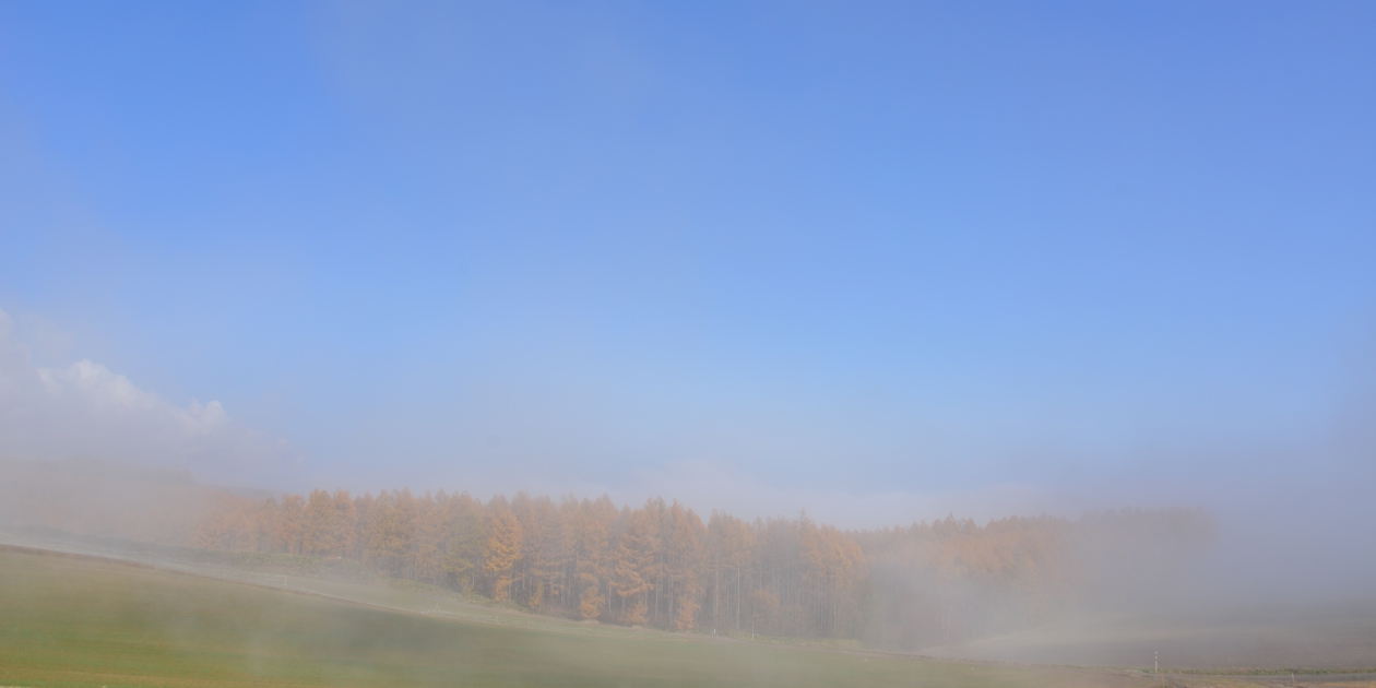 ■せっかくここまで来たのですから、やまびこ高地の展望所まで行ってみます。ちょっと下にあるからまつまで見通せて、少しばかり十勝岳連峰がぼんやり見えています。そのまま前に進んですぐに十勝岳温泉への道に出ます。上富良野市街に向けて、そのまま少し下ると再び日々霧の中に入ってしまい、上富良野市街も霧の中です。