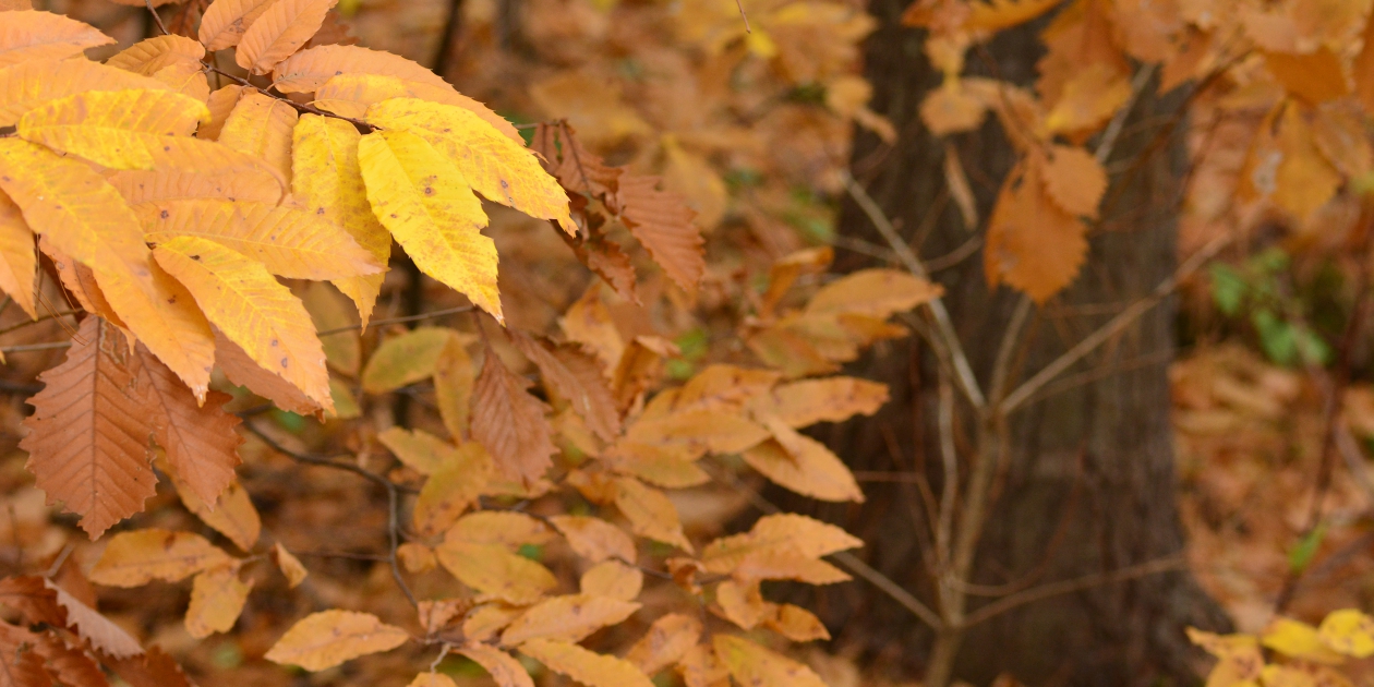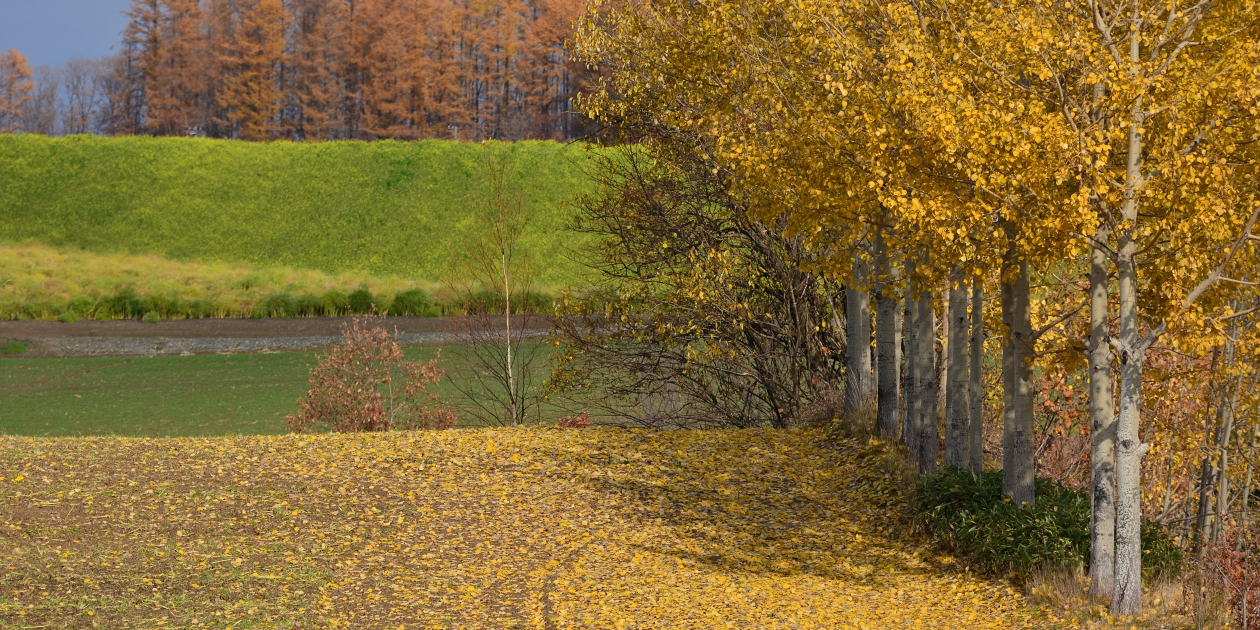 ■ずは、柘真館でカレンダーを手に入れてから、哲学の木にも寄ってみます。ちゃんと日が当たっています。東側はまだ雲が多いですが、北側は青空が出ています。何枚か撮っていきますが、少し進んだ場所で遠くに黄緑に見える畑としらかばの葉っぱが落ちて地面が色づいている場所が見えました。日が出て明るくなったので気づいたのだと思います。