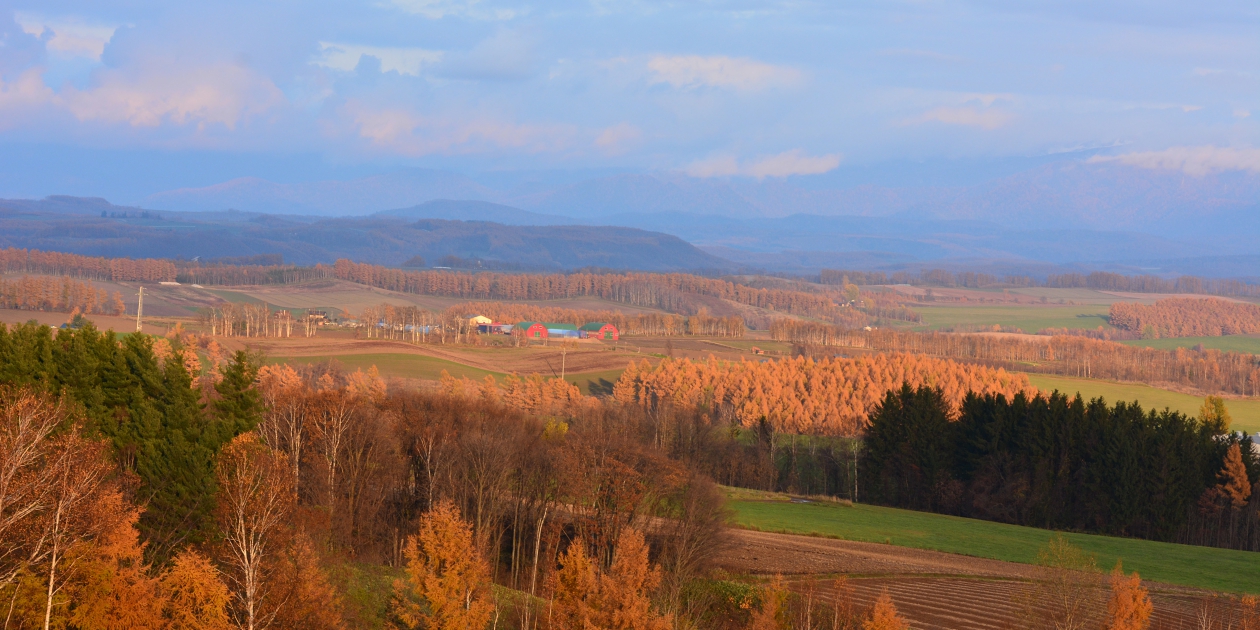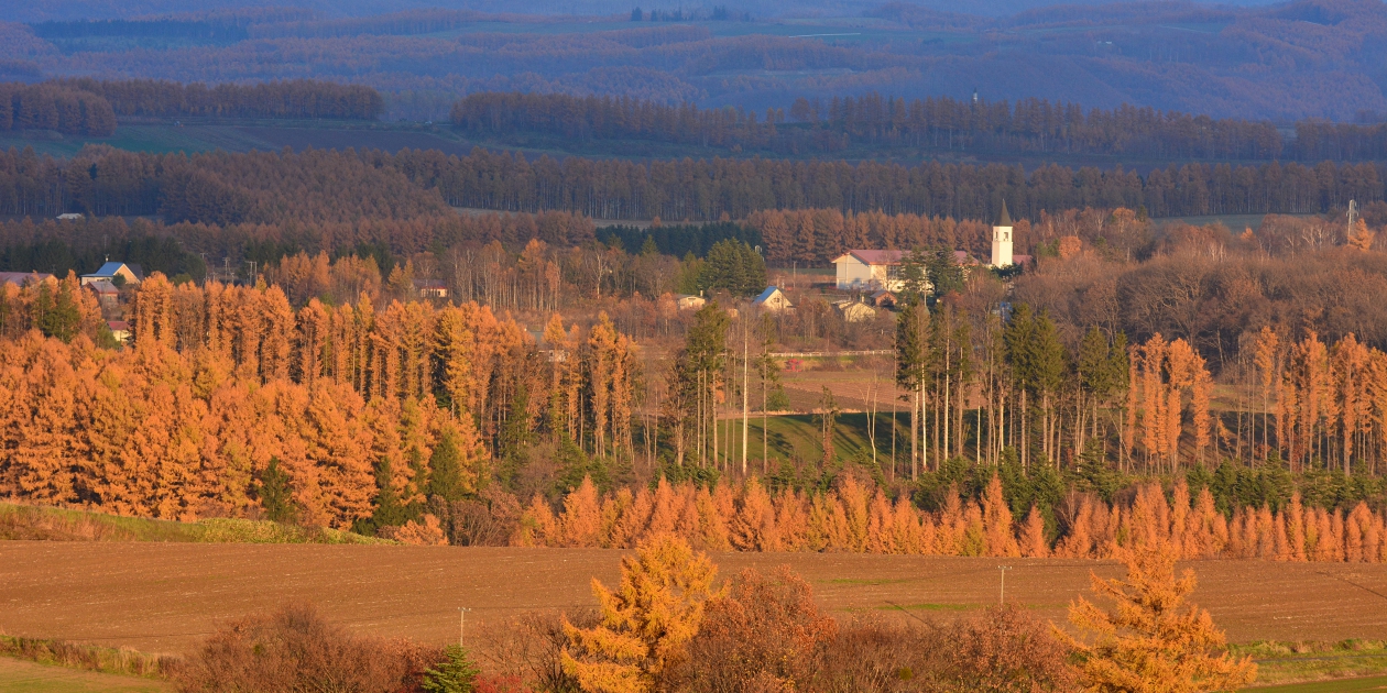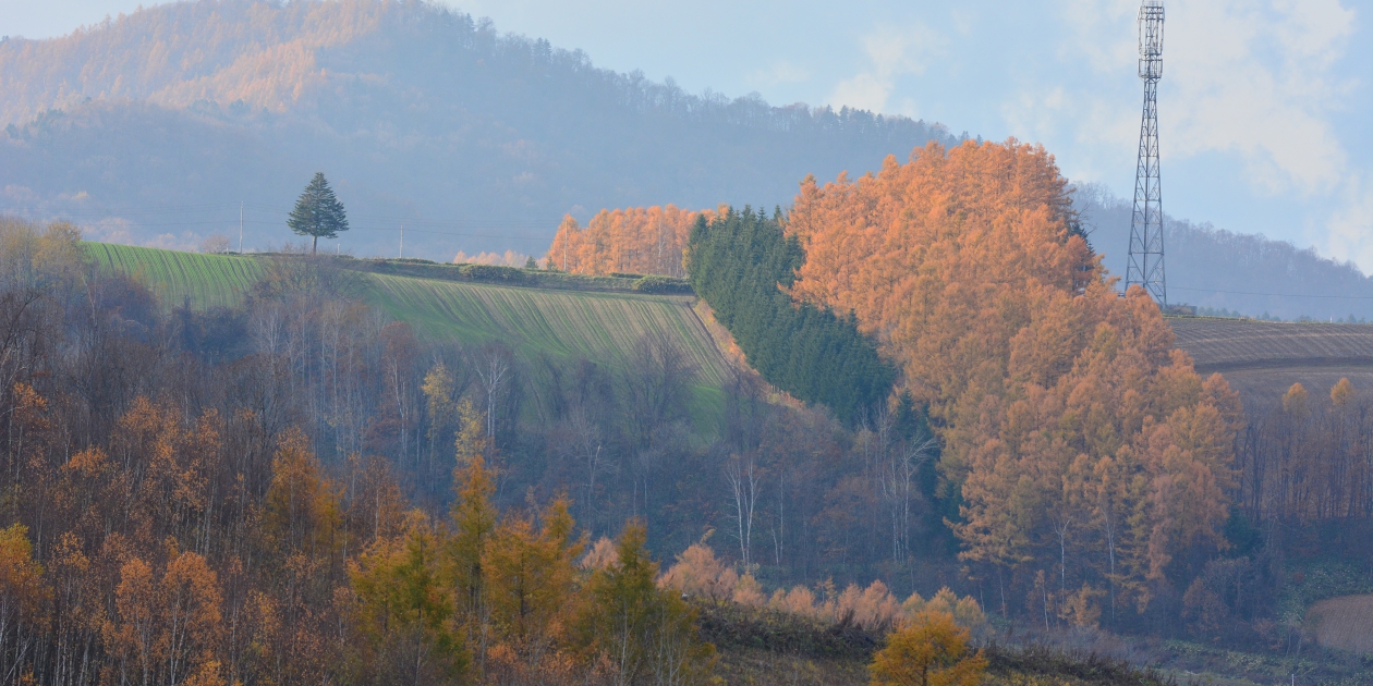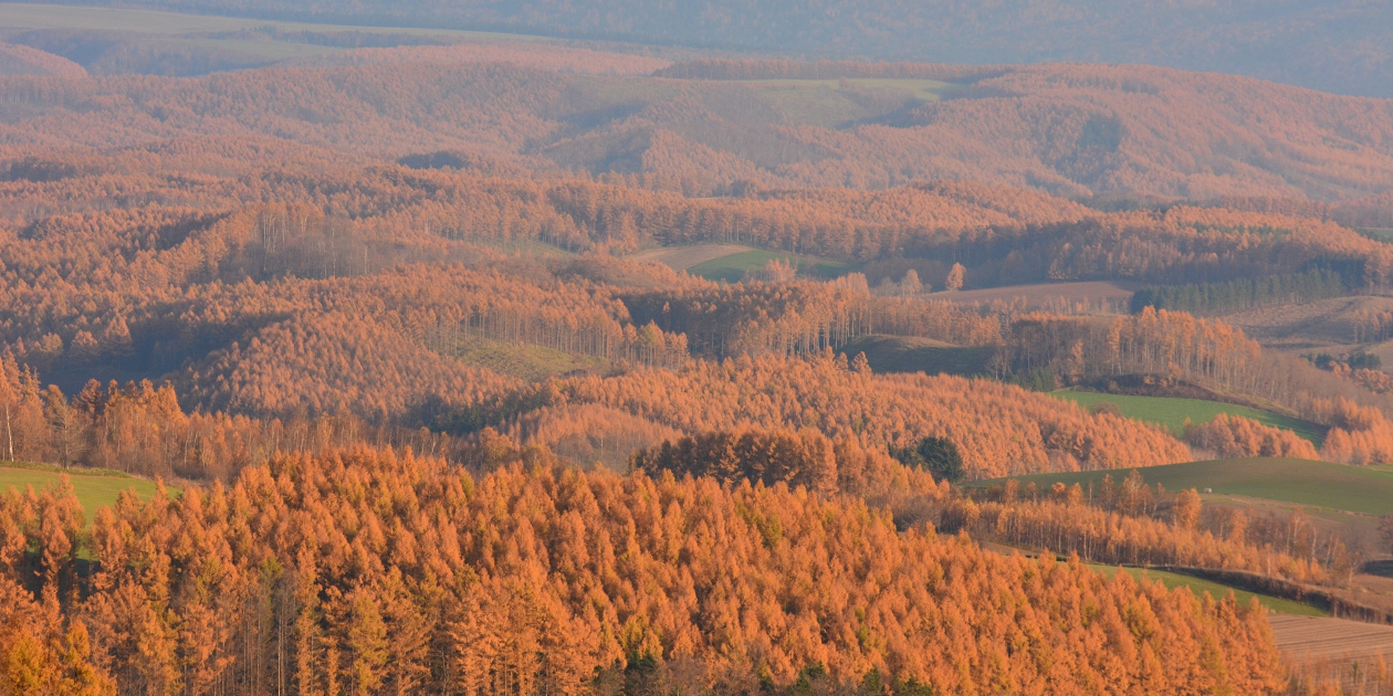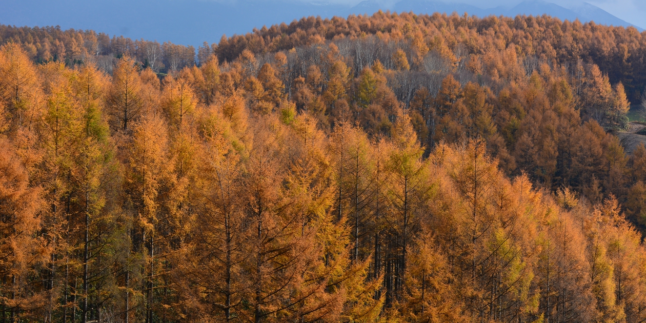 ■マイルドセブンの丘を走って裏側に回り込んで瑠辺蘂に向かいます。すでに15時を過ぎていて夕陽の体制に入らないといけません。ですが瑠辺蘂の高い場所から見ていると西日の光が、からまつの橙色をより一層引き立てていることがわかります。幸い遠くのからまつに日が当たっているようなので、しばらく遠くのからまつ撮っておきます。