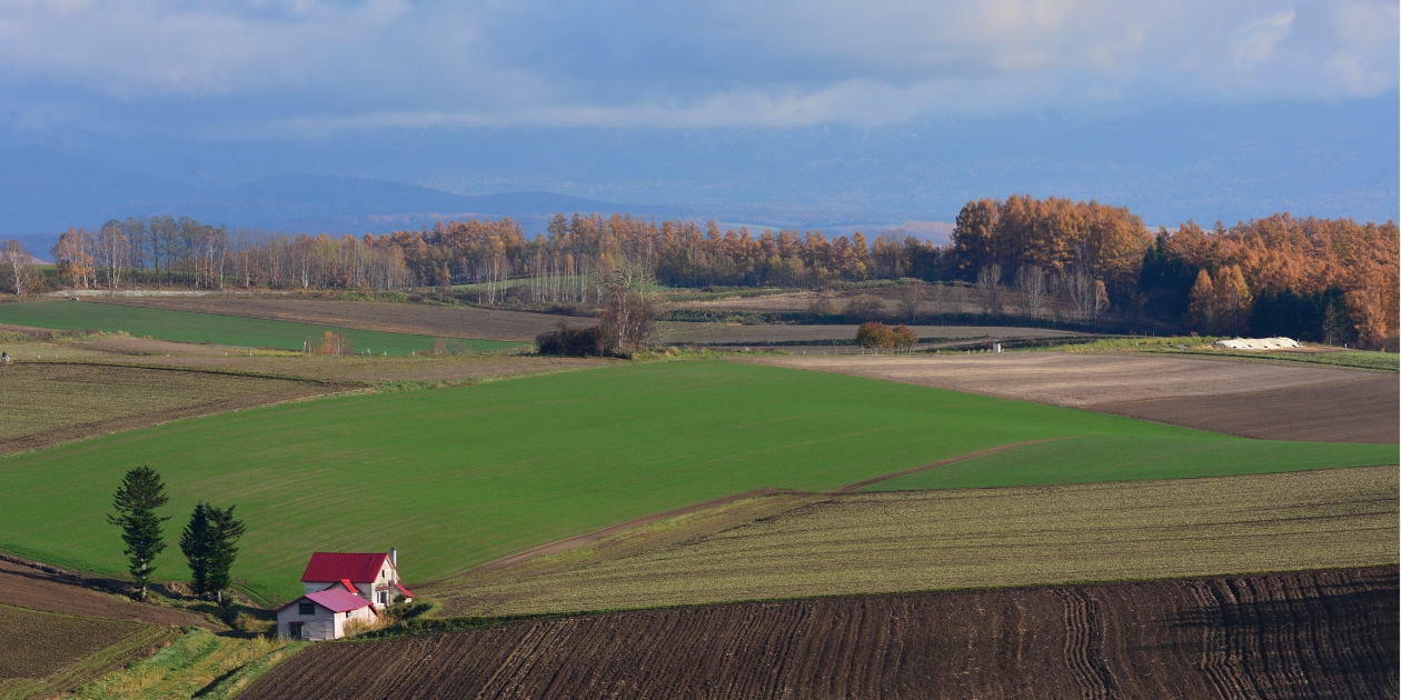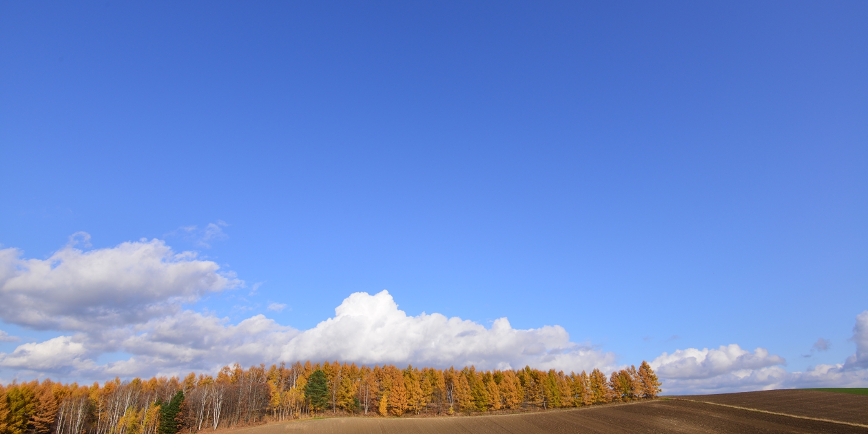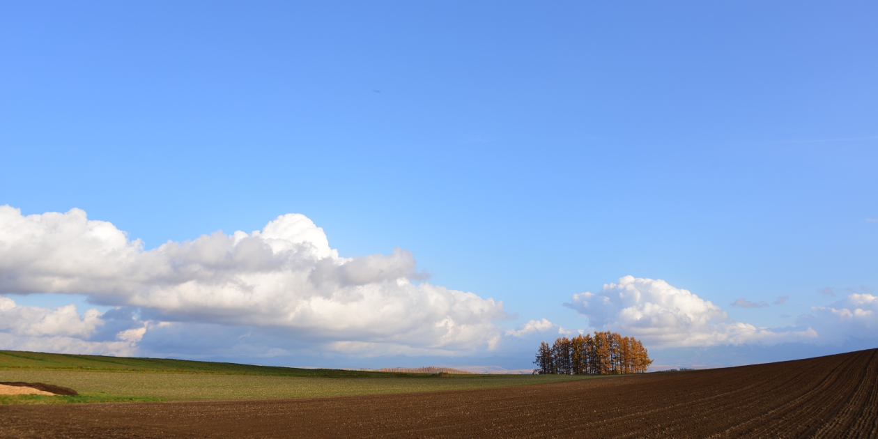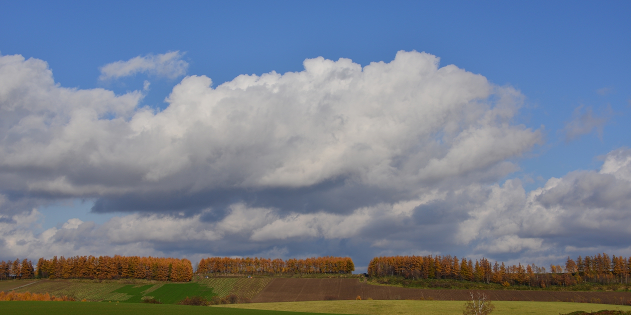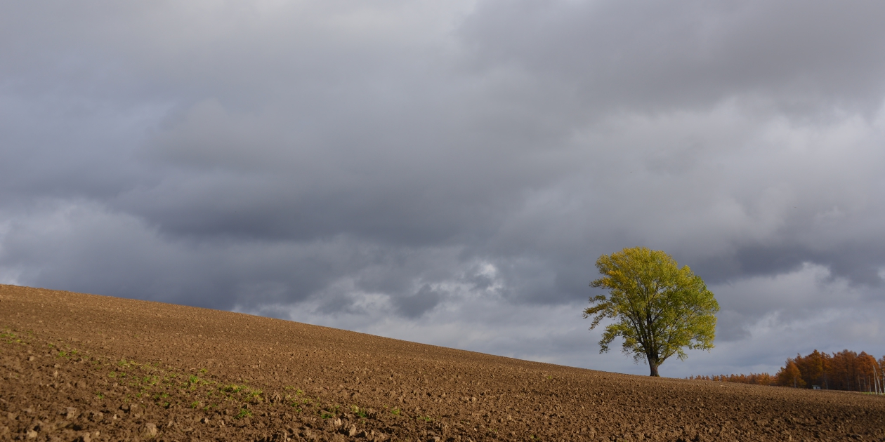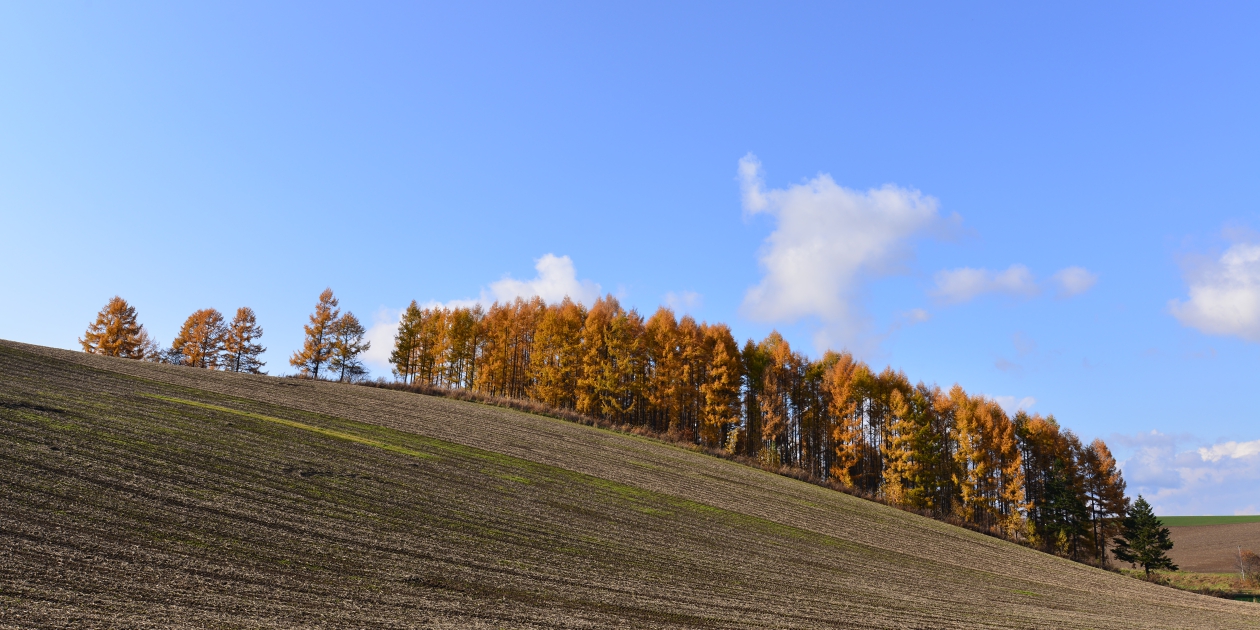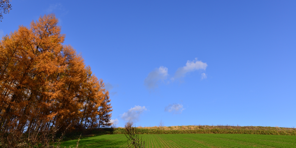 ■下に降りて新栄の丘への砂利道を上り直します。入ってすぐのからまつの林ですが、太陽が隠れたのでしばらく待ってみます。昨年は朝方日差しが強く当たっていましたが、この時間も案外濃い色に見えていい感じです。そして高い場所に上がったのですが、太陽がまた大きな雲に隠れそうです。急いで何枚か撮ってみましたが、土の色がひときわ黒っぽく、日のやわらかさがいいこげ茶色を出してくれました。