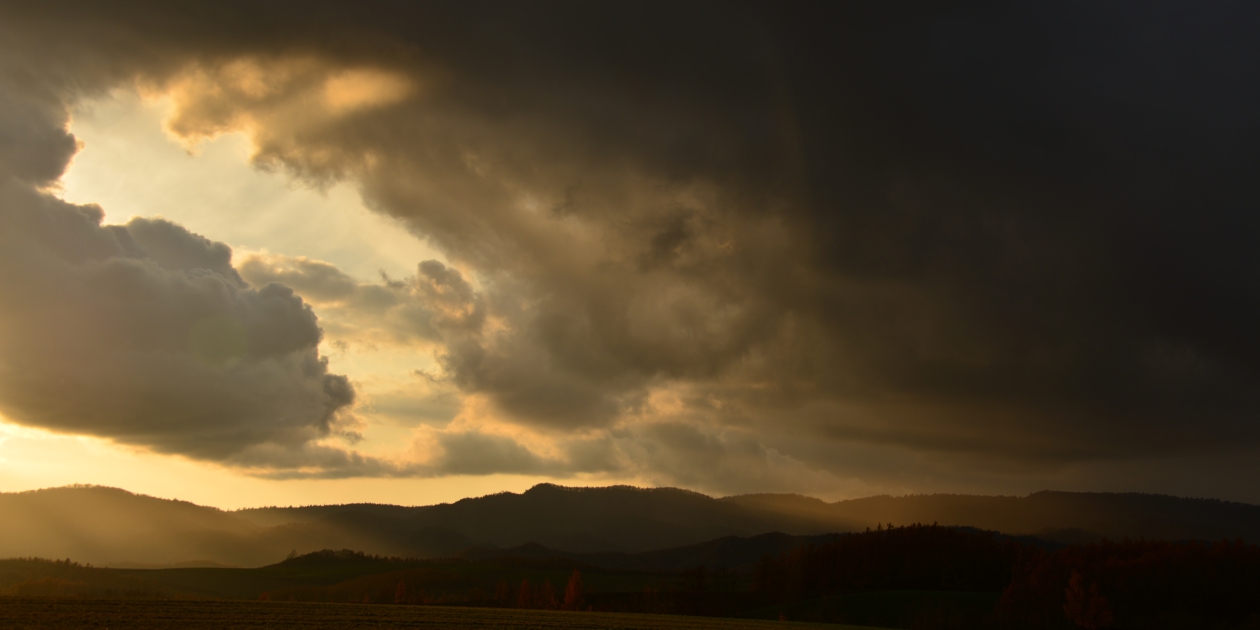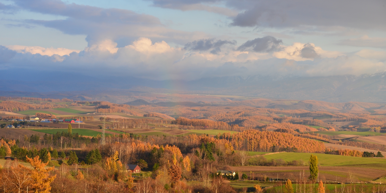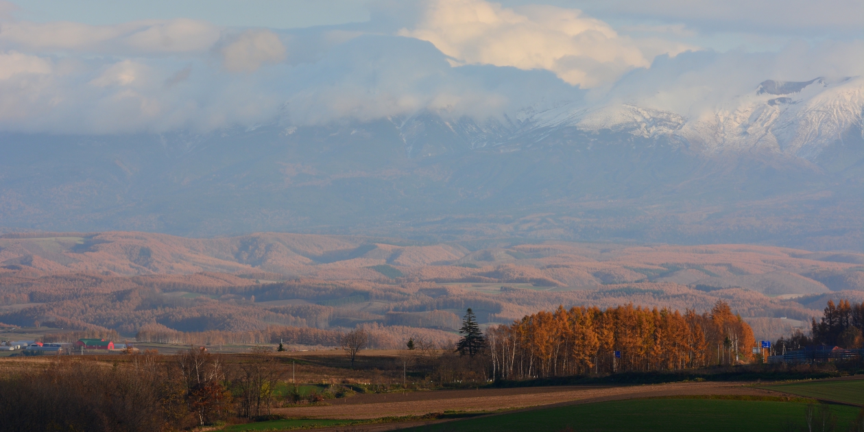 ■そのまま深山峠のお立ち台からも眺めがよかろとう寄ってみます。一人撮っておられる方がおられましたが、ご挨拶して隣で撮られていただきます。美馬牛小学校の塔に日が当たっていませんが、日が当たるまで近くのからまつをあれこれ撮ってみます。うっすら虹も見えていましたが、カメラに入ると見えづらくなります。また、山々の様子が少しだけ見えかけていました。背後から日の光が照りつけていますが、気になって振り向くと太陽、からまつあきことセットにあるようなので、少し飛ばしぎみに何枚か撮ってみました。なかなかいい感じです。
