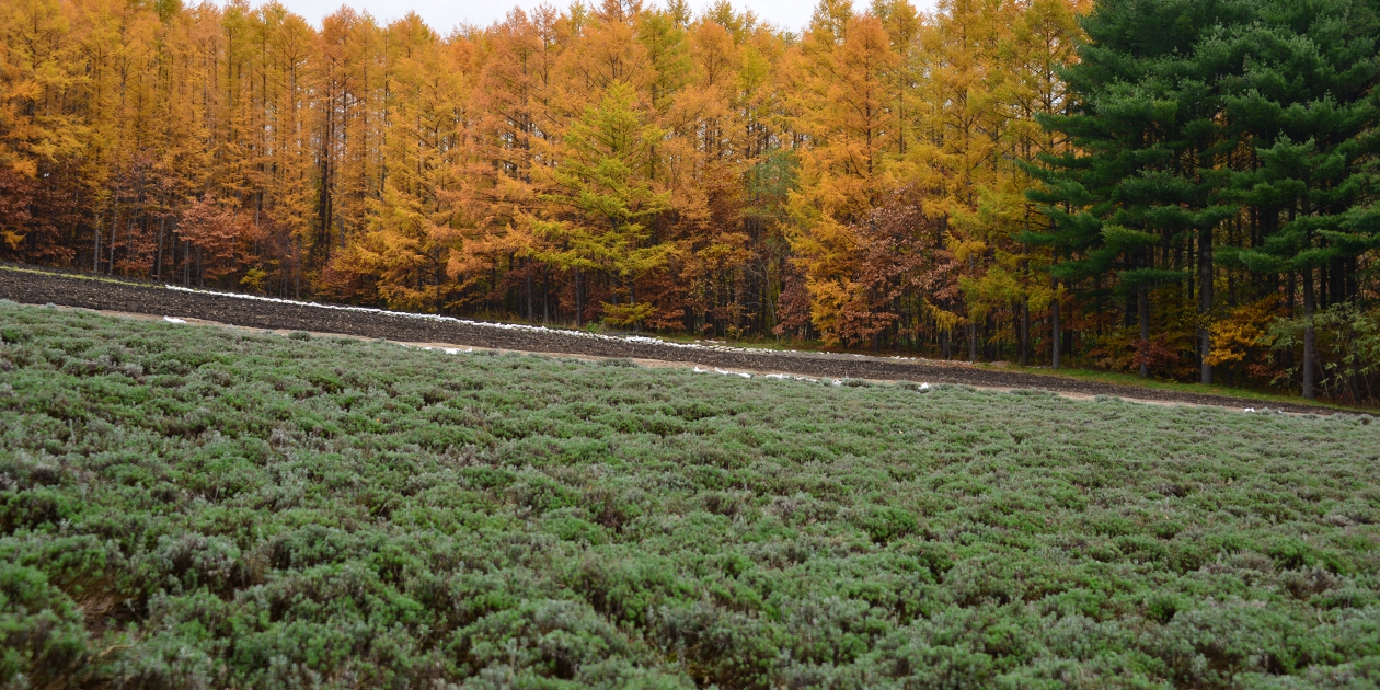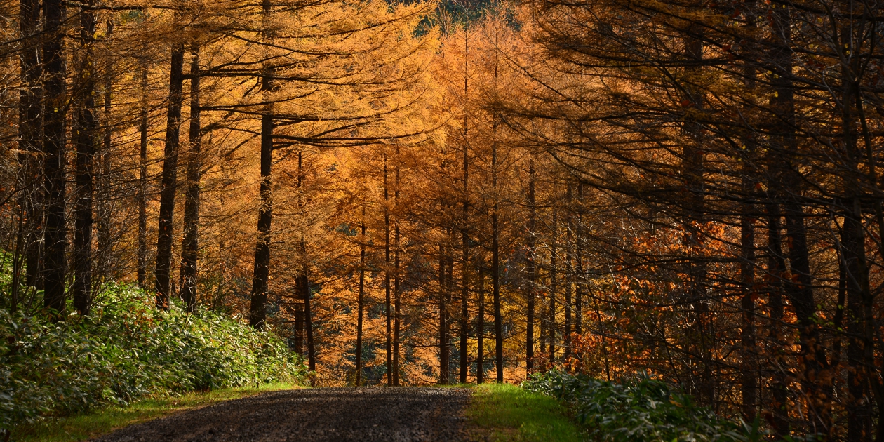 ■下から見上げるラベンダー畑の奥の木々はみんなからまつで、きれいに色づいています。からまつ林に小道が続いていますが、車の轍の跡がきれいにからまつの葉っぱをふんで筋になっています。森の舎を少し上がったところには、からまつの木々に混じって広葉樹があり、橙色に色づいています。ちよっと葉っぱは汚れていますが、いい感じに見えます。
