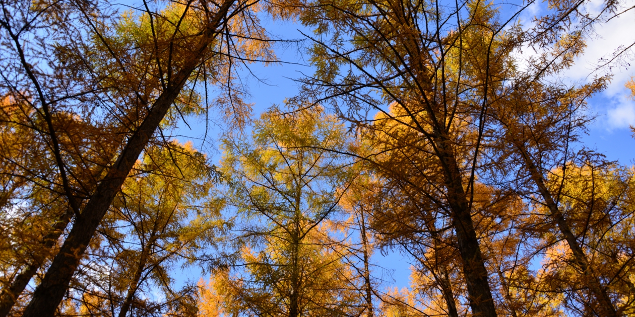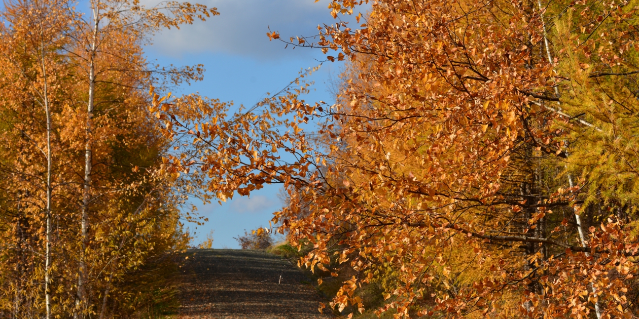 ■続いて柘真館の前を通って哲学の木の横を通って、そのまままっすぐ砂利道に入り、からまつ林の中を抜けます。少しだけだいぶ傾いた日差しが射してくれて斜面にあるからまつに日が当たりました。もう少し下に降りて下から先ほどのからまつを振り返ると、高い場所だけ日が当たっているのが見えます。