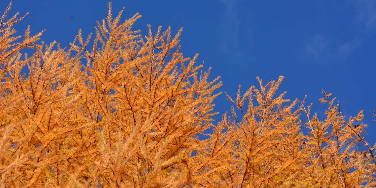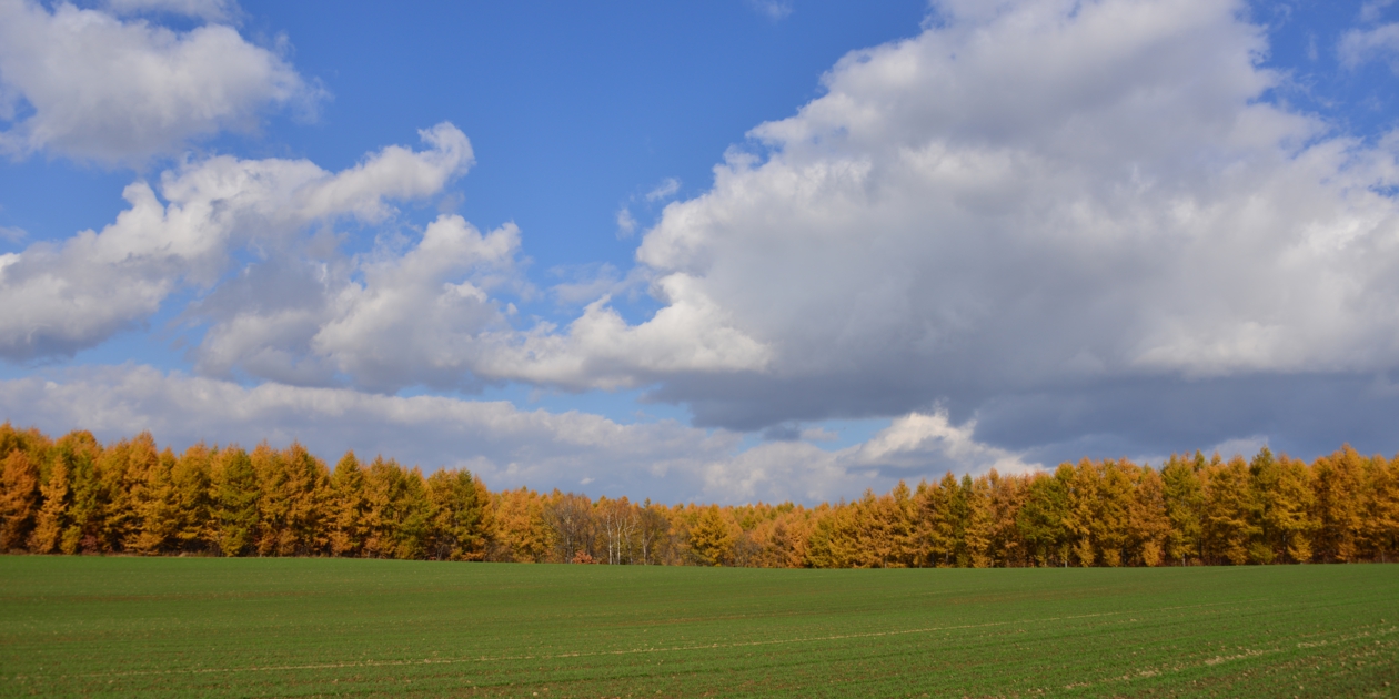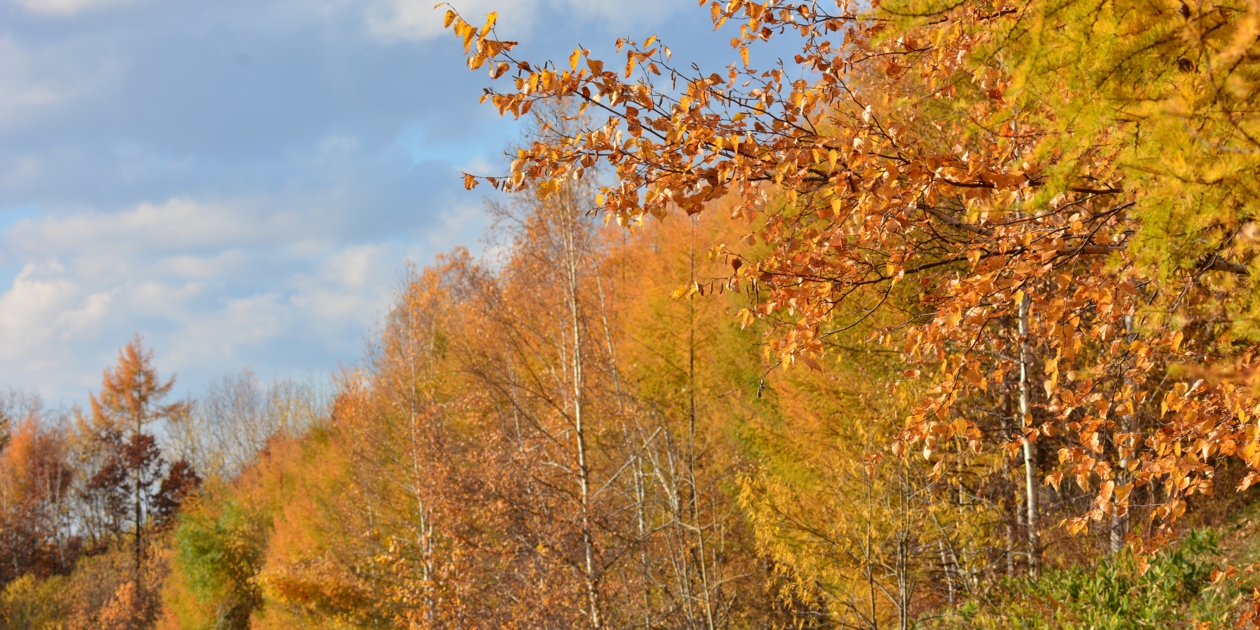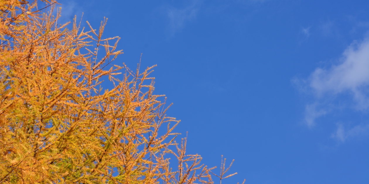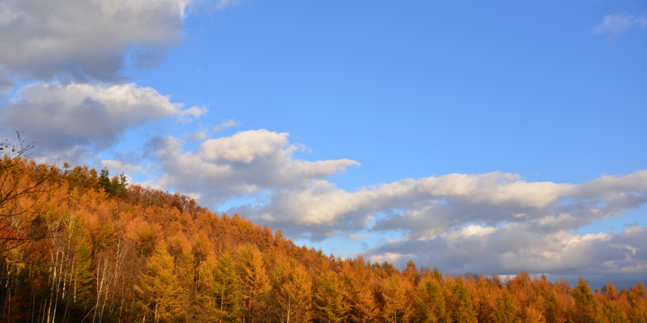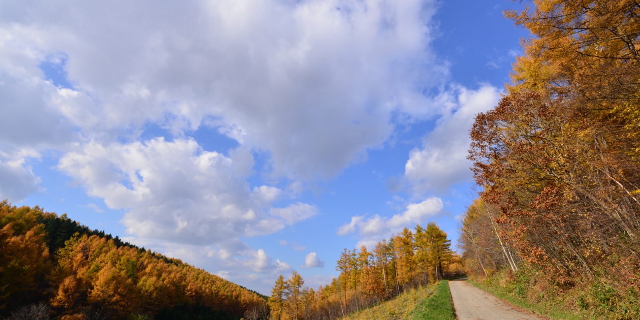 ■一旦柏木山近くまで行き、下方向に見下ろす感じので左右に広がるからまつ林もしっかり色づいていて、日が射すまでしばらく待つ価値はある場所です。また、柏木山側にある道沿いにあるからまつも西日に当たるととってもきれいです。続いて道を戻っていき、夏にじゃがいものお花がとってもきれいだった場所に寄って行くと、ここもまた青空とからまつの茶色がいいかんじで輝いていました。また、少し先を右に入っていくと両側にからまつがあって、こちらも日差しにいきいきと輝いています。畑はなにもありませんが、からまつだけ目立ちます。