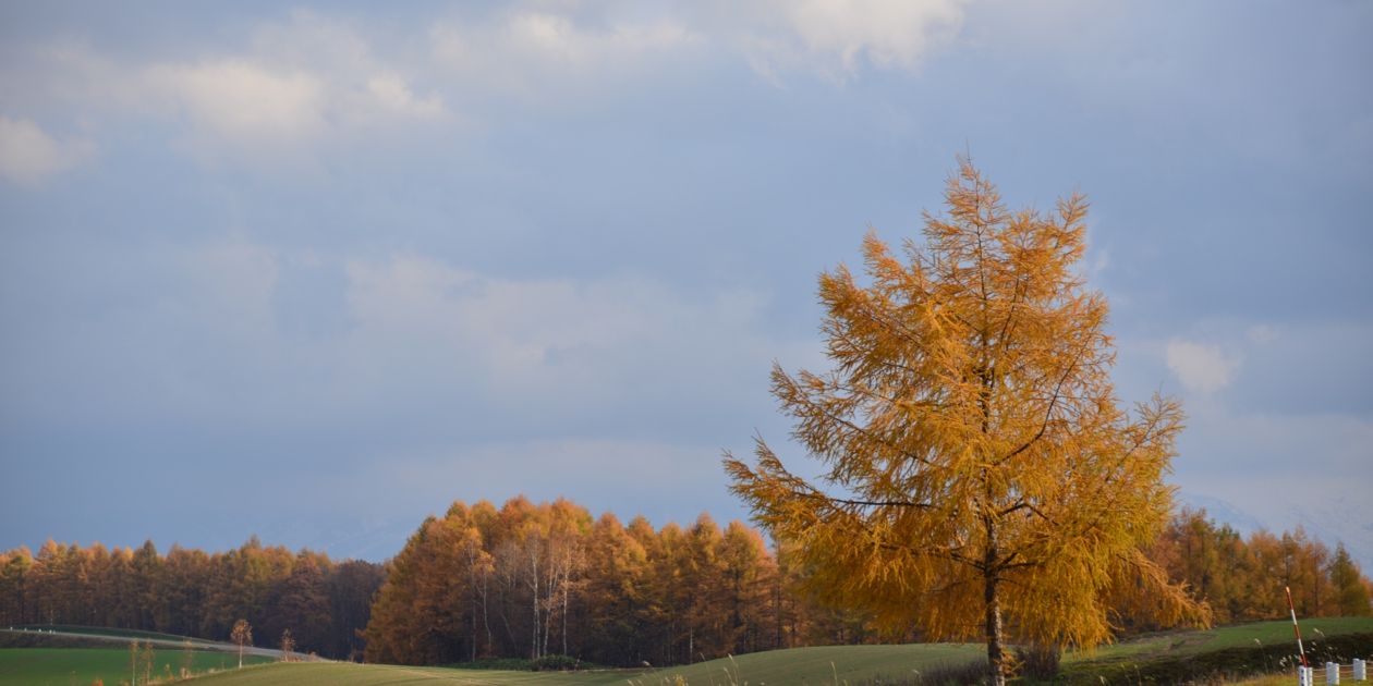 ■そのまま行くと先ほどあきらめた道に戻ってしまうので、左に曲がって高い場所にでます。ちょっと走ると赤羽で見た方がいました。そのまま美瑛市街方向に進んで、高い場所から下にあるからまつを何枚か撮っておきます。
