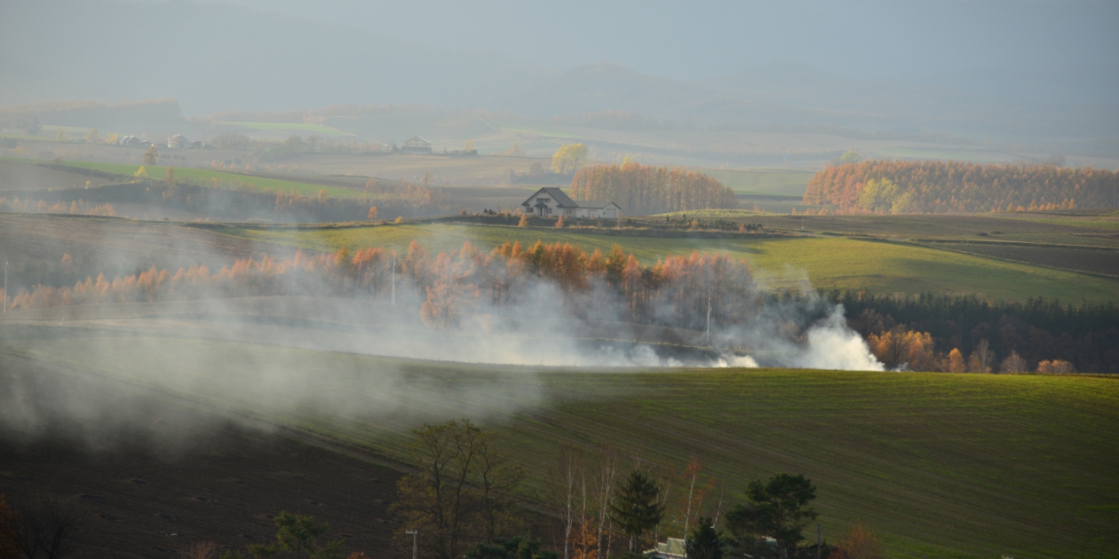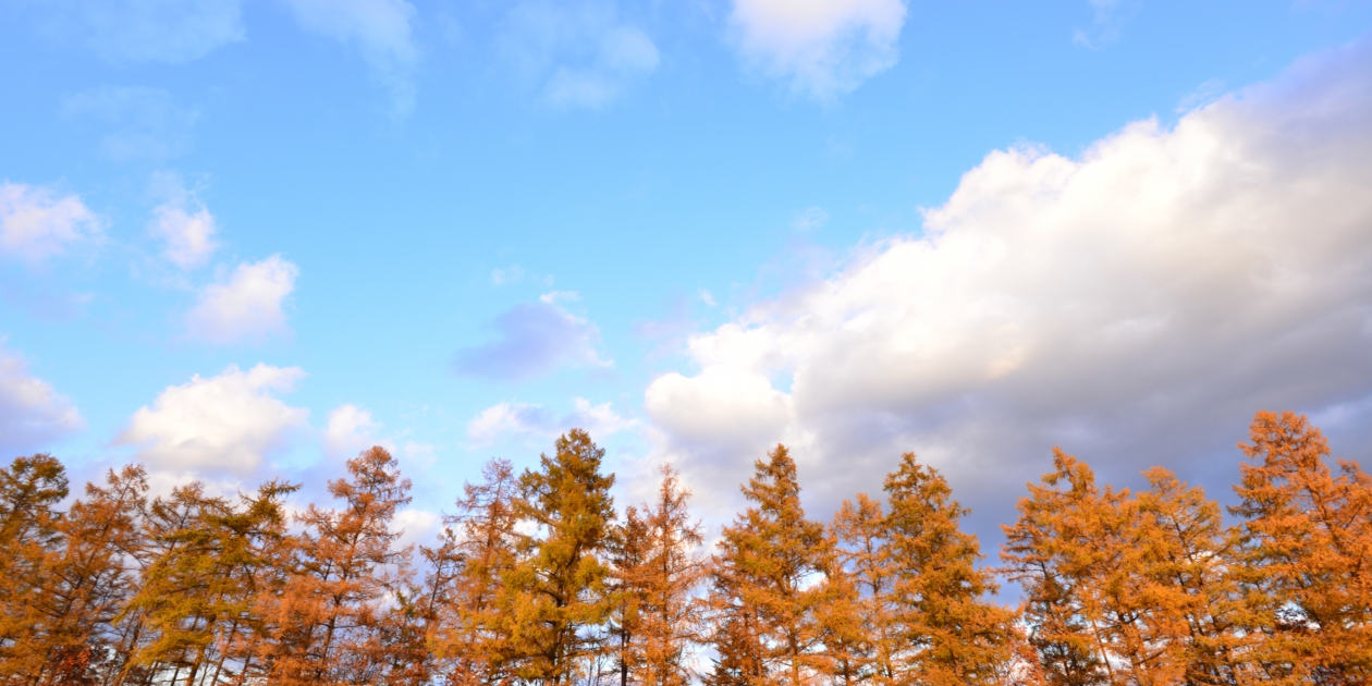■色に感動したところで、行くところを迷いつつ結局三愛の丘の前のからまつを見ることにしました。三愛の丘着く頃には日差しがよく出ていてまぶしい光が届いていましした。正面のからまつとトイレ裏側のしらかばと日差しを入れて撮っておきます。さきほど走ってきた道でマメを収穫したあとの葉っぱを燃やしていてましたが、ここから見ると煙が昇って絵になっていました。