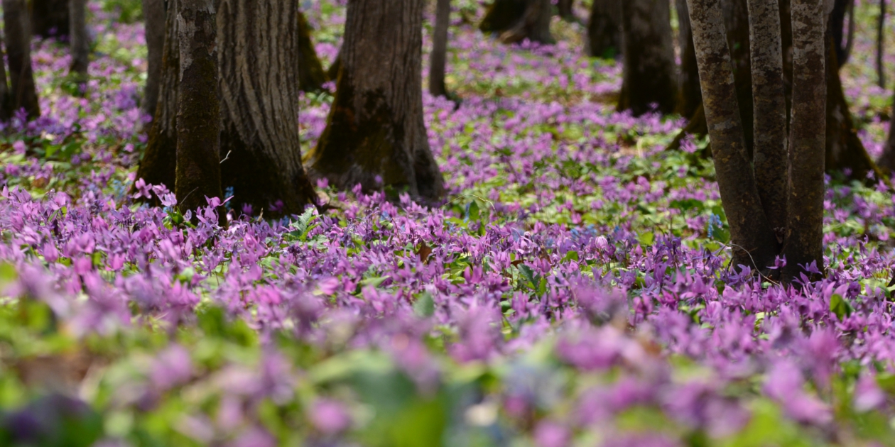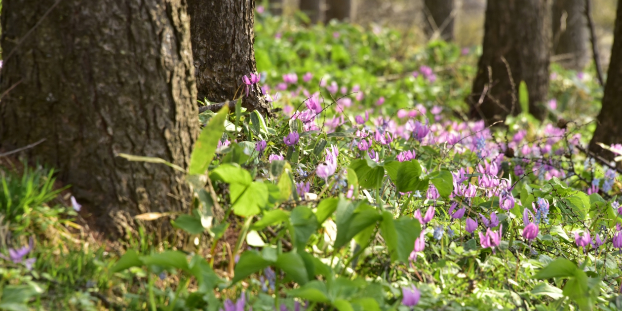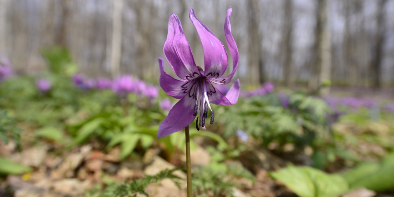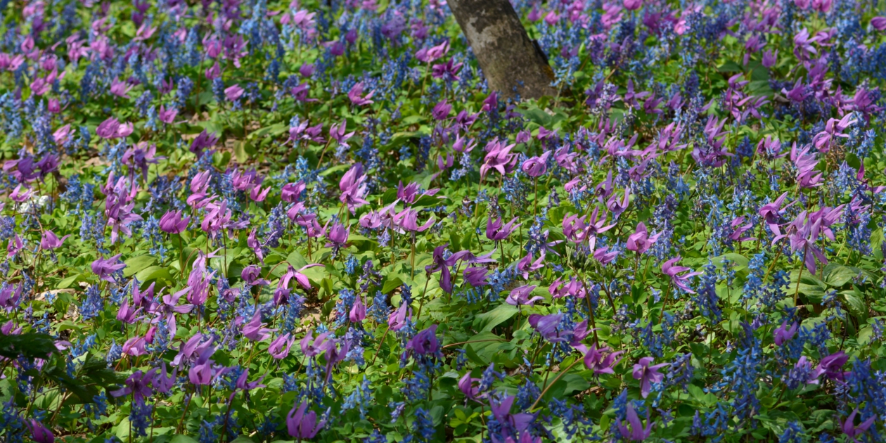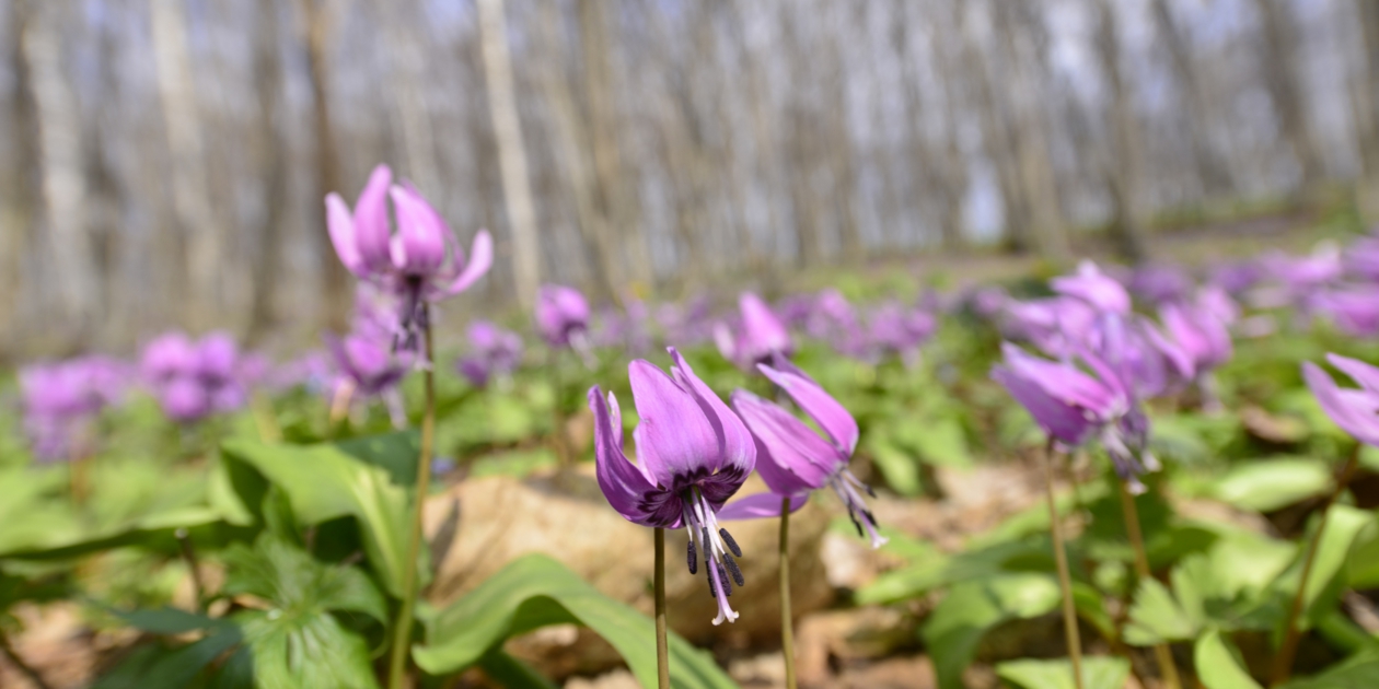 すでにお昼が過ぎていましたが、たくさんの人が来ていて車を停める場所も奥側しか空いていない位です。出店も繁盛していて帰りにうどんでも食べて帰りたくなるくらいです。カタクリですが日当たりのよい場所は、すでに色があせ始めていましたが、全体で見ると紫色とエゾエンゴサクの空色が広がっていていい感じでした。エンレイソウはまだでしたが、キクザキイチゲ、ニリンソウなども咲いていました。上から見下ろす様子や下から見上げる全体の様子もなかなかです。白いカタクリも入り口近くに今年も咲いていましたし、ザゼンソウもひと株だけ咲いているのを見つけました。出口近くの沢にはミヤマキ