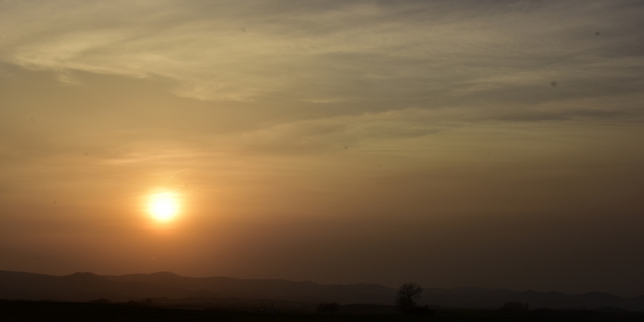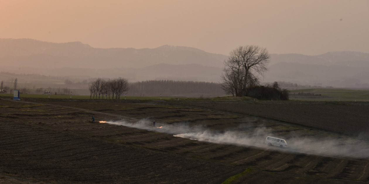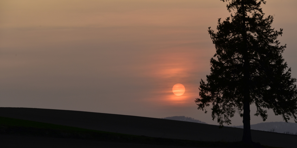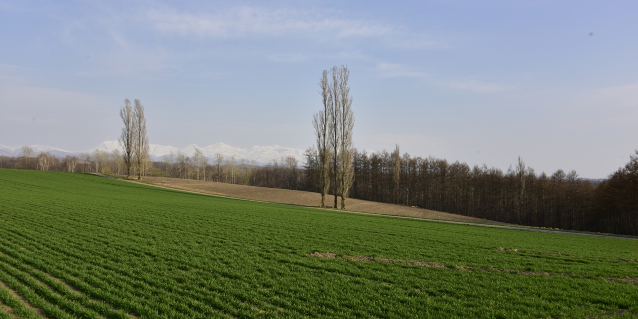 東神楽から志知内を通って坊子山を走って行きます。山は見えていますが春霞でうっすらです。ちょうど夕方なので赤羽でからまつの陰を見ていきます。高い側はあきこが入っていて、下側は何も入っていませんでしたが、木々の陰が見えていました。
