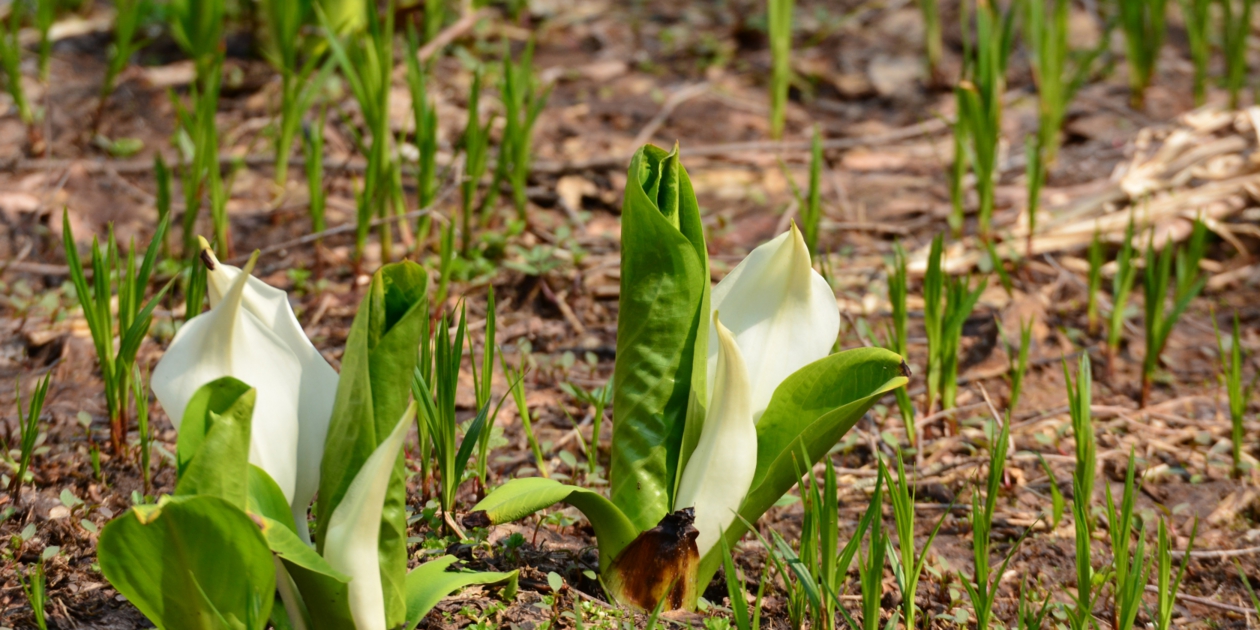 ■ 時計回りに歩きましたが、左側のミズバショウとっても威勢がよく、偏って群生していました。ところどころにザゼンソウあり、バイケイソウもあり、鳥たちがいっぱい鳴いている日の良く射す森を歩きました。ミズバショウもたくさんありますが、所々に座禅草もあります。フクジュソウとエンゴサクと黄色のお花は地面を歩く道沿いにあります。