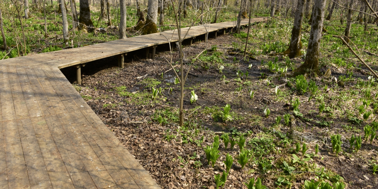 ■ しばらくは葉っぱが積もった腐葉土の道を歩きます。以前より木の歩道までが長くなった感じがします。やっと木の道が見えました。木道の手前にはバイケイソウの葉っぱがあちこちから出ていて、踏まないようにあるかなくてはいけません。以前の木道に比べ幅が広くなっていて、もしかしたら車いすでも入れるかもと思いましたが、手前と行った先にややぬかるみの地面がありますので、うまく対応しないと通過できないようです。