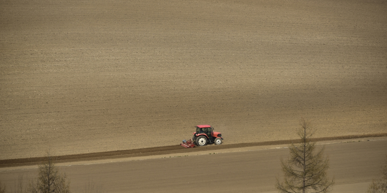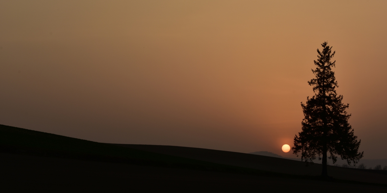 ■高い場所から少し下がって1本の木が見える場所に移動し、太陽に絡めた木の様子を撮ってみました。納得したところで国道を越えて美瑛牧場に向かいます。丘の下側に立つ1本の木と太陽がからまないかと思いましたが、端っこから斜めに見るうな状態でないと、太陽と木はセットにできないようです。