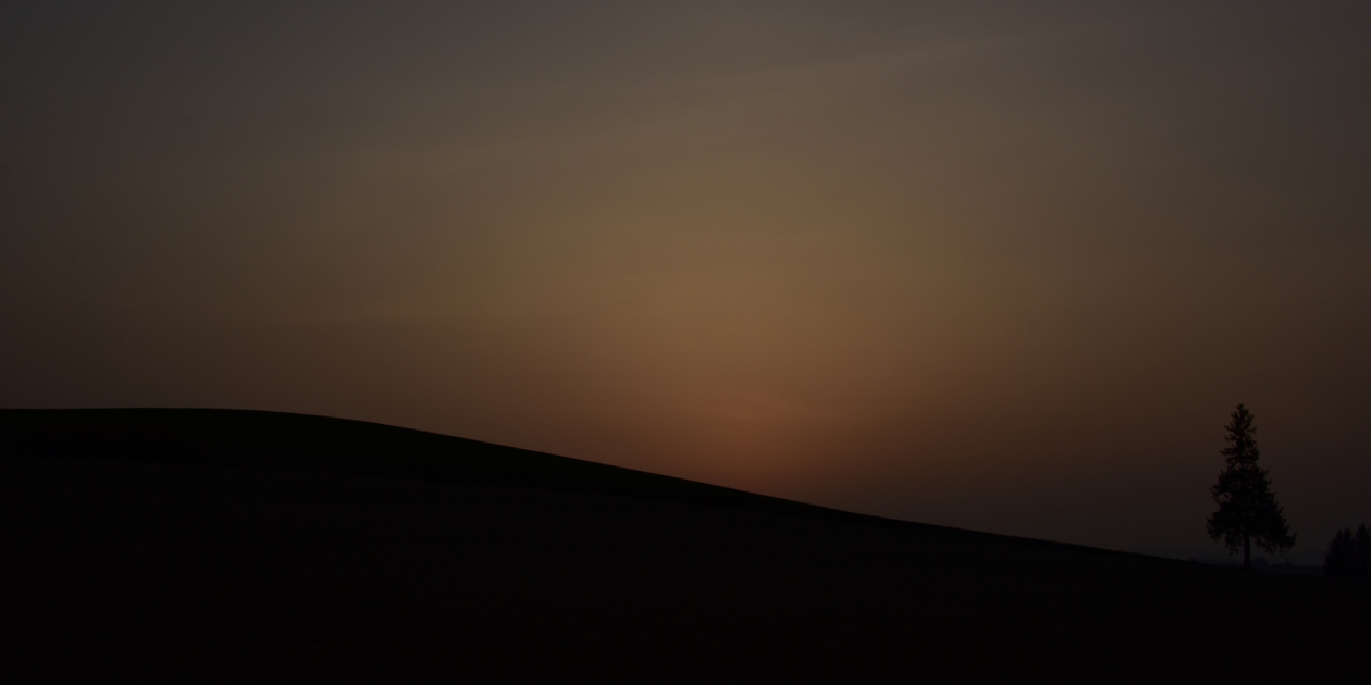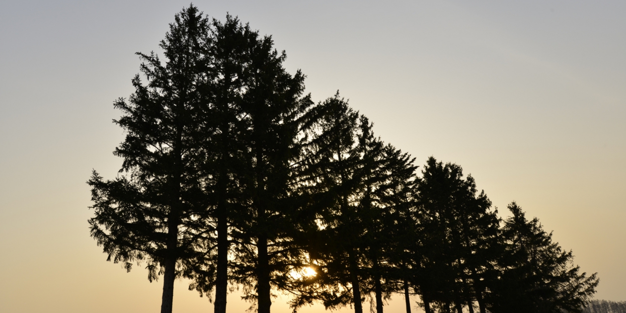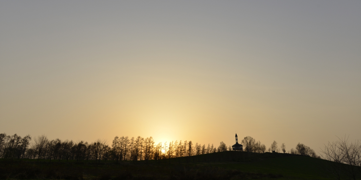 ■ ぎりぎりのタイミングで千代田の丘に行ってみます。牧場横、水沢ダムの遊歩道がある付近にエゾマツが並んで植えてあって、丁度夕陽の太陽が下側にやってきます。道からすぐ目の前なので、14mmの広角で見上げるように撮ります。大きく写るのと遠くの木が小さく写り、短い距離ですが迫力あります。パノラマロードのからまつに夕陽がきらきらしているのをみながら、千代田ファームの中を通って、三愛の丘近くまで進みます。三愛の丘手前の下り坂を下りて、福美沢から再び美馬牛方向に走って、最短でクリスマスツリーの木に移動します。