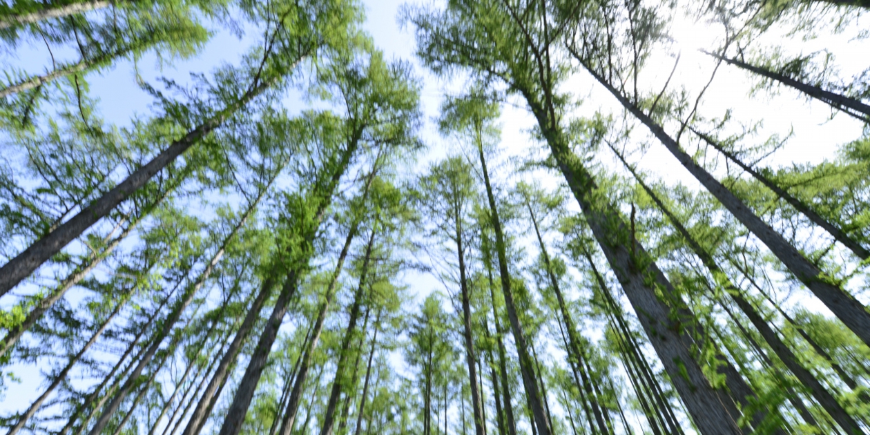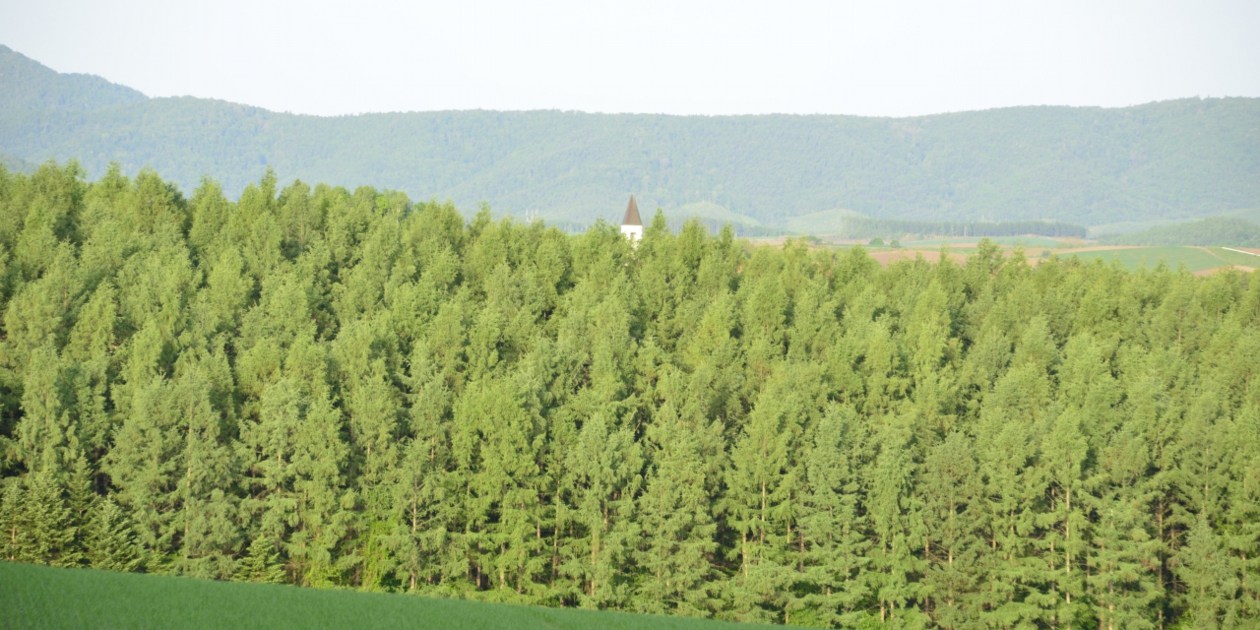 ■ 高橋牧場の前とパノラマロードを通って平行四辺形の木と旭岳を見て、美馬牛小学校の塔をからまつ越しから撮ってみます。塔の先っちょしか見えていなく、木は大きく成長しています。5時頃にはとぅもろうさんに戻ってきます。