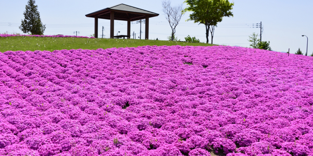 9.市街に入り、美瑛選果にが見えたら右に曲がり、正面に咲きほこる芝桜を見ていきました。赤い色の芝桜はまだらですが、