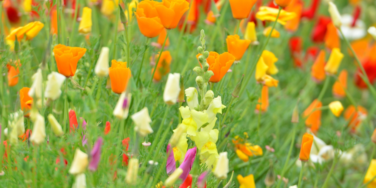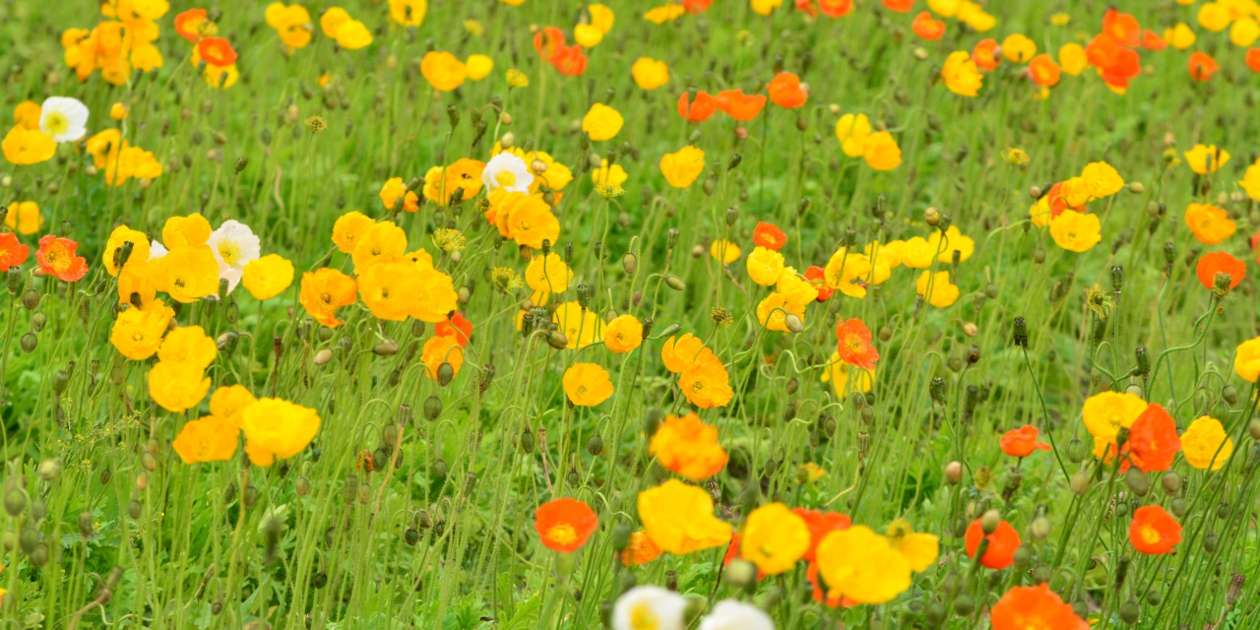 さらに下側には、ハナビシソウがトラクター乗り場までびっしり入っていました。マリーゴールド、ペチュニアなどありましたが、まだ大きくなっていませんでした。ラベンダーも色づいてはいますが、なんとなく株が小さくお花も少なめでした。トラクターバスの乗り場に近い側は、アイスランドポピーと、カルフォルニアポピーがあり、その先にはつぼみのユリ、黄色でからしなが入っています。一番端っこは、ヒマワリのようで7月に入ってからの開花しそうで準備中です。