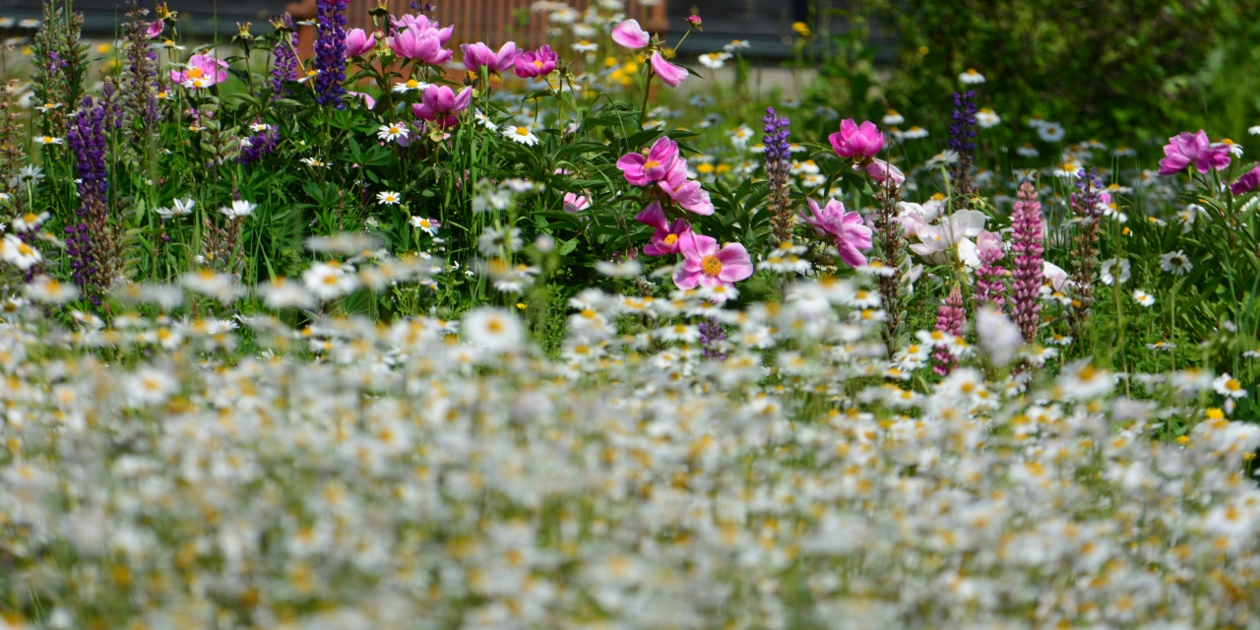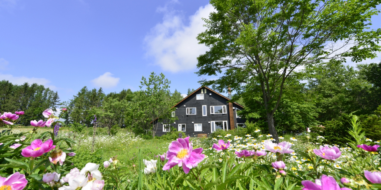 そのお花に覆われるようにとぅもろうさんの建物が見えていて、この時期の写りが一番建物をかわいく見せてくれます。また、何年か前に植えた芍薬がたくさん咲くようになり、ピンク色のお花が、白いシャスターデージーの中で目立っています。入り口の見に花壇には、ピンクのナデシコと白のラムズイヤーがきれいに咲いています。
