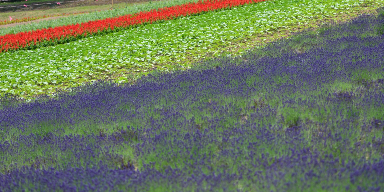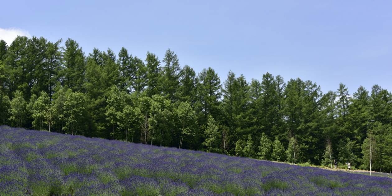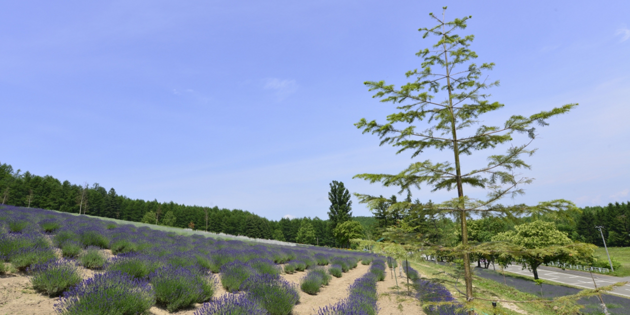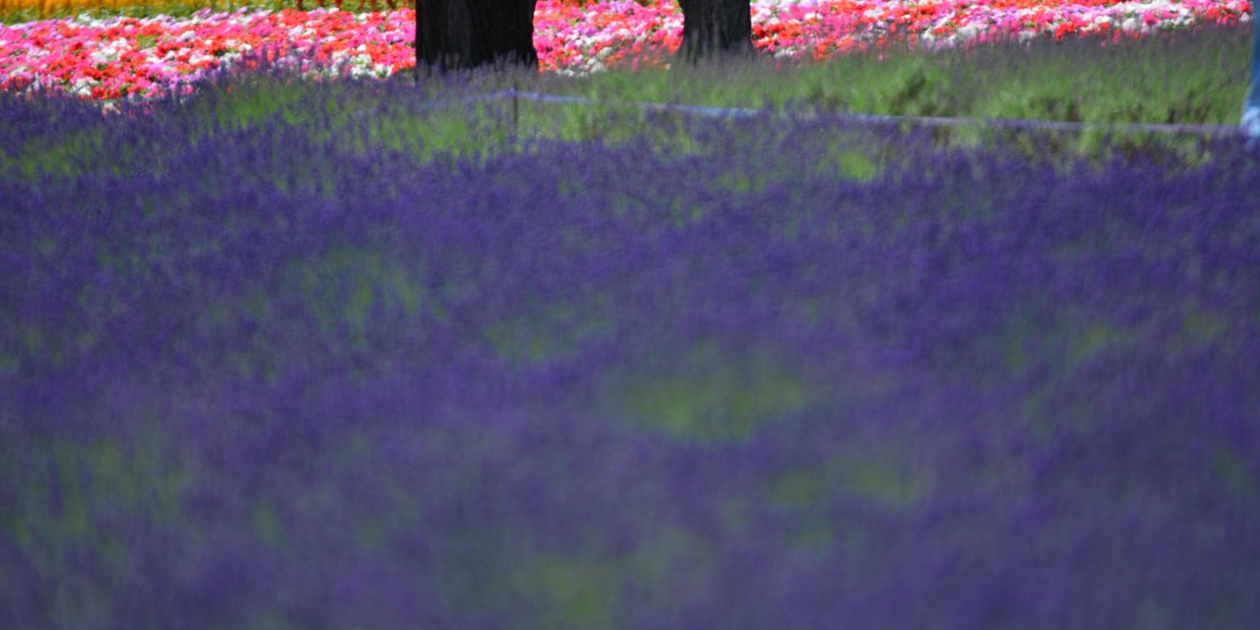 ■ はなもいわとおかむらさきとの境に以前はフランスギクがありましたが、無くなってしまい、薄い黄色のヤロウが入っていました。また、坂を登って奥まで続くラベンダー畑は、すでにきれいに色づいていて、濃紫早咲きの濃いめの紫と薄い目のはなもいわがセットで撮れます。背後のからまつの緑と空の青色が相まっていい感じです。咲き始める前のつぼみの時期が一番むら無く濃く色がでているような気がします。下側にあるからまつの幹を入れつつ撮ることもでき、なかなかいい感じとなります。下から見て右手側には、ポピー系のお花が準備中で来月はとっても彩り豊かに見れそうです。