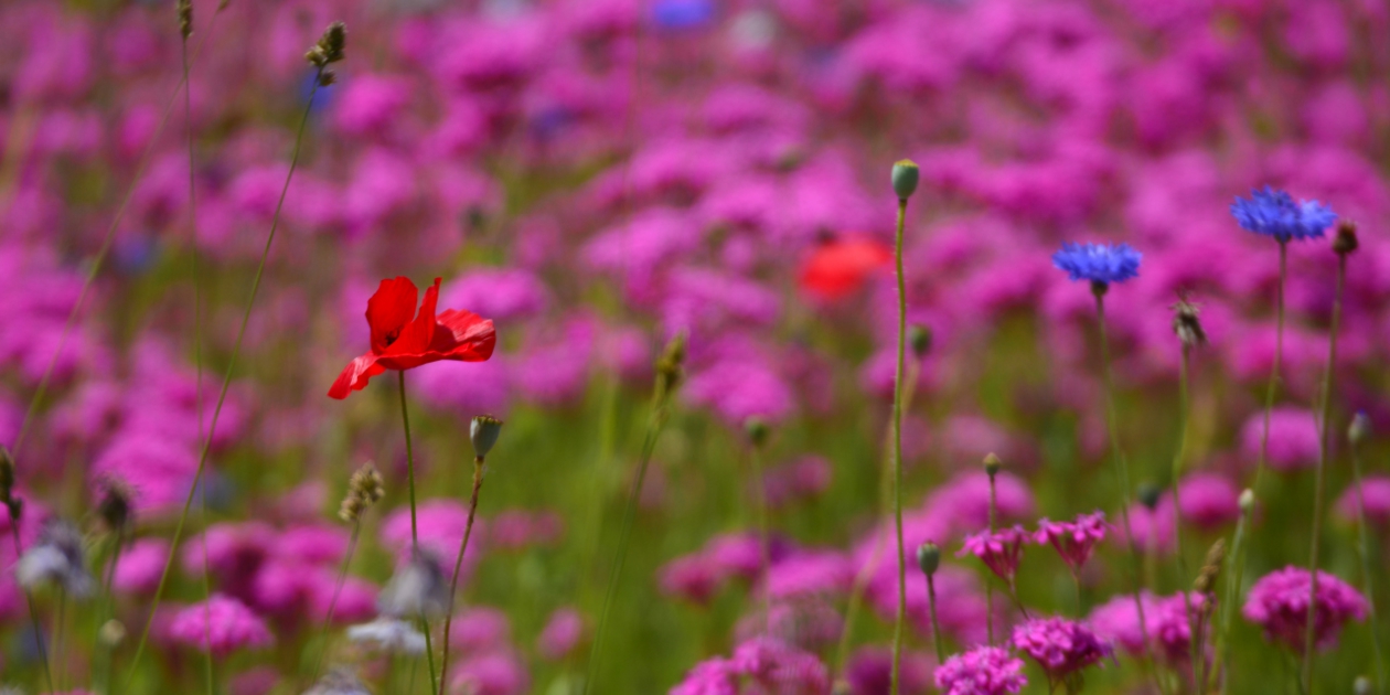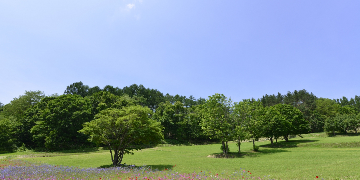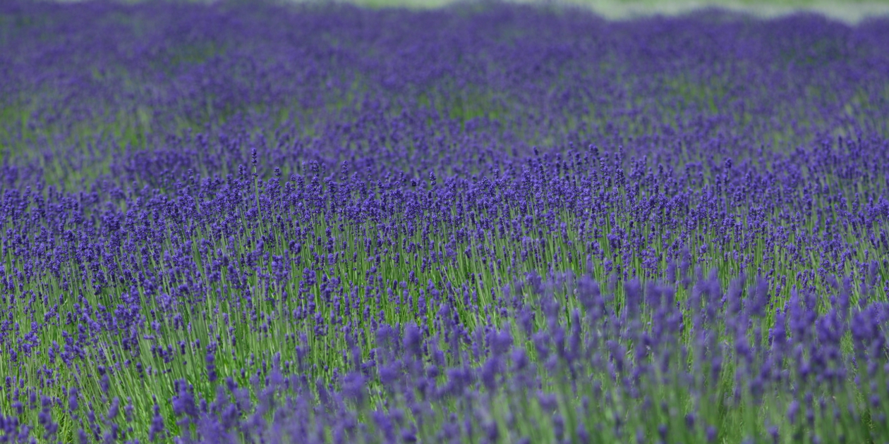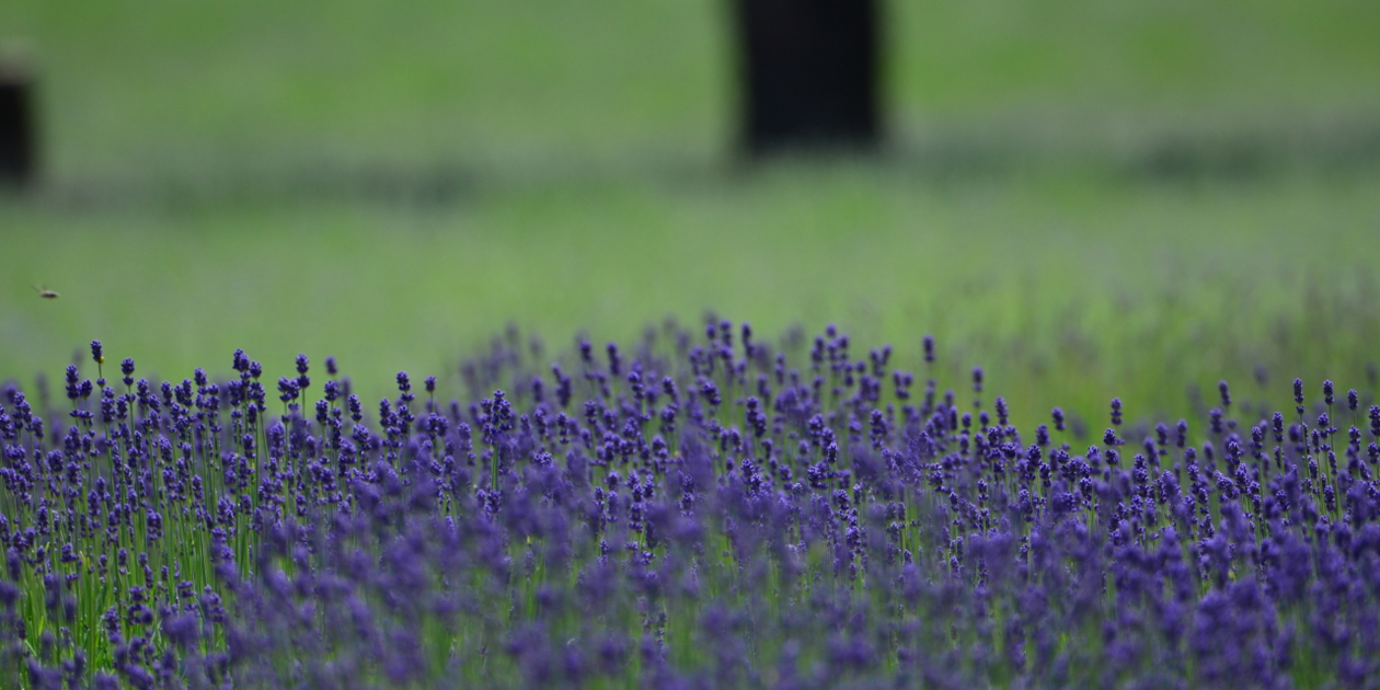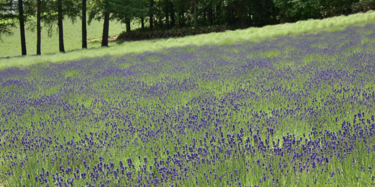 ■ はなもいわとおかむらさきとの境に以前はフランスギクがありましたが、無くなってしまい、薄い黄色のヤロウが入っていました。また、坂を登って奥まで続くラベンダー畑は、すでにきれいに色づいていて、濃紫早咲きの濃いめの紫と薄い目のはなもいわがセットで撮れます。背後のからまつの緑と空の青色が相まっていい感じです。咲き始める前のつぼみの時期が一番むら無く濃く色がでているような気がします。下側にあるからまつの幹を入れつつ撮ることもでき、なかなかいい感じとなります。下から見て右手側には、ポピー系のお花が準備中で来月はとっても彩り豊かに見れそうです。