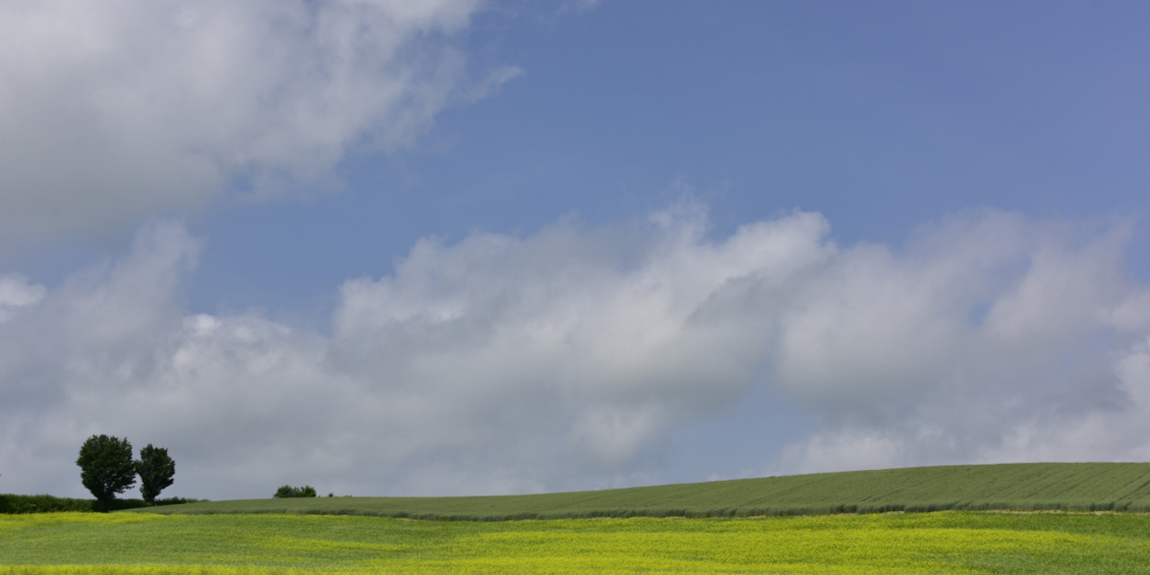 ■ ちょっと進んで花七曜さんの反対側の斜面にからしなが入っていて、手前の麦と黄色と空の雲がセットで見れました。ジェットコースターの路の上富良野八景の看板のある場所で下方向の様子を撮ってみます。ここはジャガイモのようですが、まだお花がありません。冬に撮ったサイロの位置を見ながら、この時期の様子を近い形で撮ってみます。