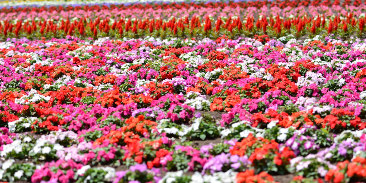 ■ 南北方向に道筋が6本あり、高い場所から下に向けて7つの畑が整理されています。東西には主な道が3本ありますが、先ほどの6本の道で上から5,6本目の道から南側に歩いて行けます。一旦下る感じでたどり着くと再び登りになり、両サイドにお花が植えられています。まだ、咲いている株はほとんどなく7月、8月向けに仕立てあるようです。また、ノロッコ号もこちらにまわるルートがあるようで、走行していきました。料金が違うのか、コース別に案内しているか詳しく見てきませんでした。