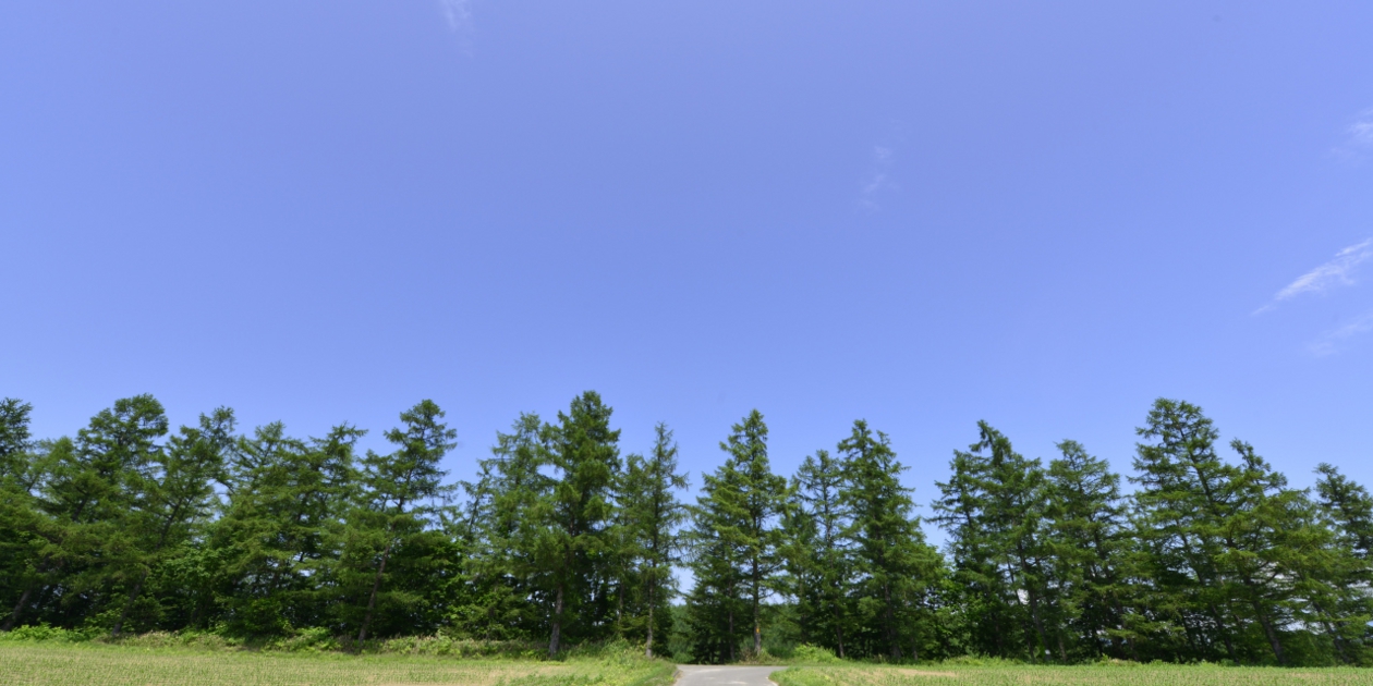 ■ 道の終点近くの牧場からは高い場所にある木を空とセットで撮ることができました。突き当たりのからまつもしっかり見えて青空はやっぱりいいですね。日新ダム側におりてピルケの森に向かいます。観光案内所に北西の丘にいるいつもの方がこちらで一人でいるとのことでご挨拶しておきます。