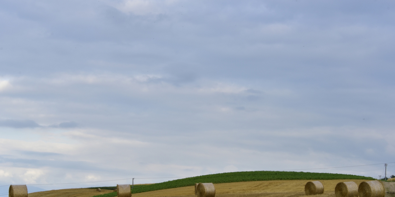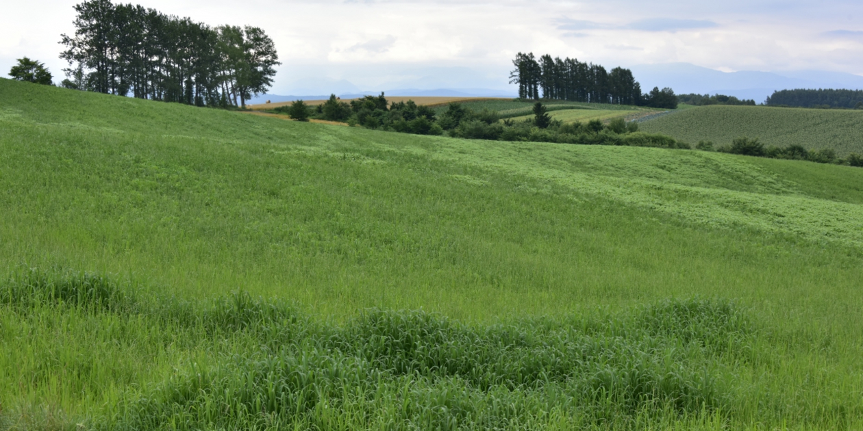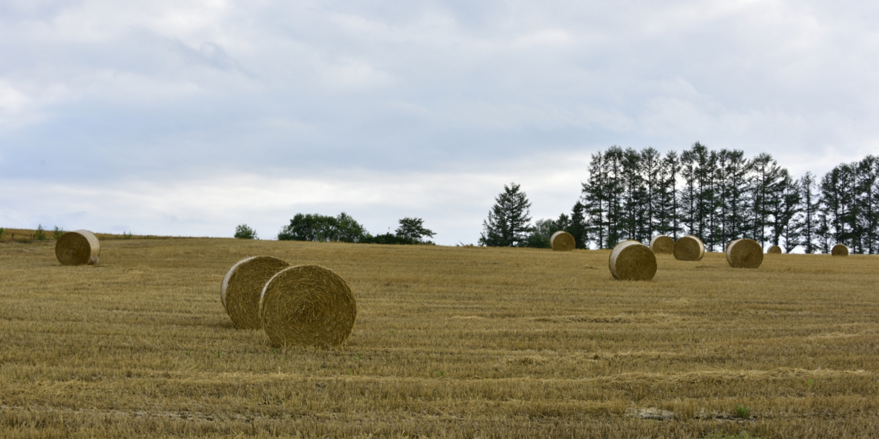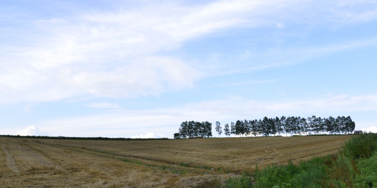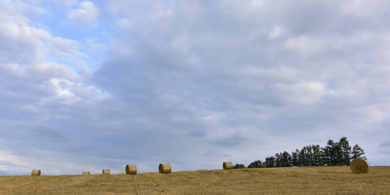 ■ ちょっとだけ国道に出てすぐにセブンスターの木の東側に出る道を走ります。幹で方向の空は雲が薄いのですが、太陽は見えず雲が後ろから照らされて眩しく光っています。セブンスターの木を越えて少しおりてしらかばを振り返ります。東側は少しだけ空が見えていますが、しらかばに光が当たらないので暗い感じです。手前にあった麦は刈り取られているように見えましたが、どうなんでしょうか。茎の部分は残っているように見えたのですが、こういう刈り方なのでしょうか。