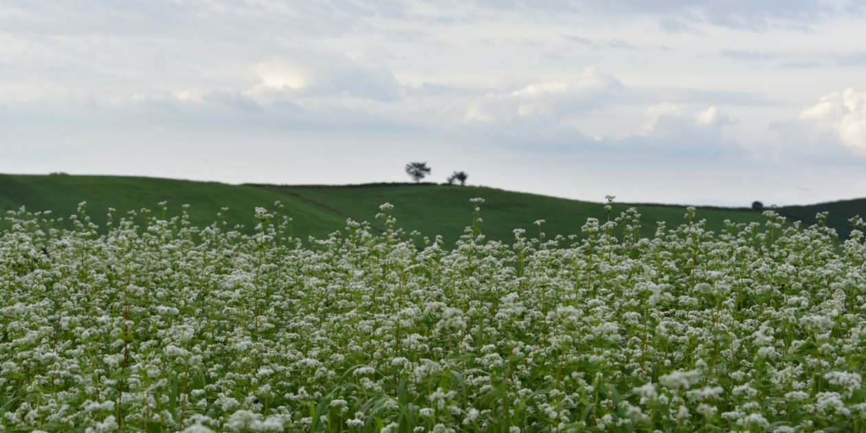 その先には、からしなが植えてある場所があり、さらに奥の兄弟の木に向かって緑が駆け抜けています。晴れていたら黄色と緑がいい感じになると思います。一旦街中におりてお買い物をしているうちに空はぐっと暗くなってしまいました。